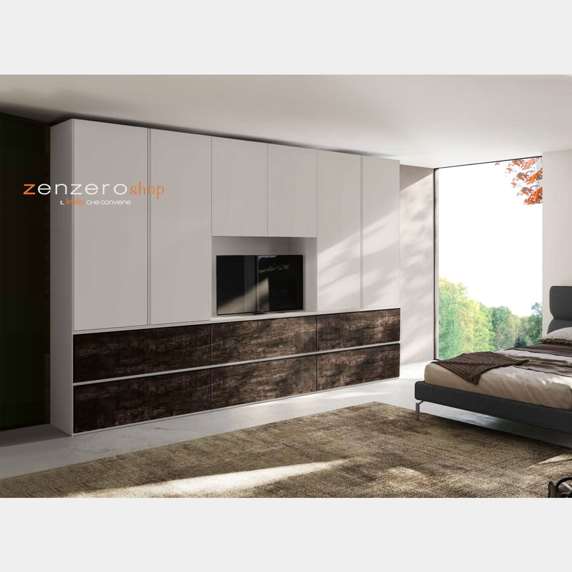 L'armadio è caratterizzato dalla presenza di 6 ante battenti poste su 6 cassettoni, al centro è previsto un vano tv.