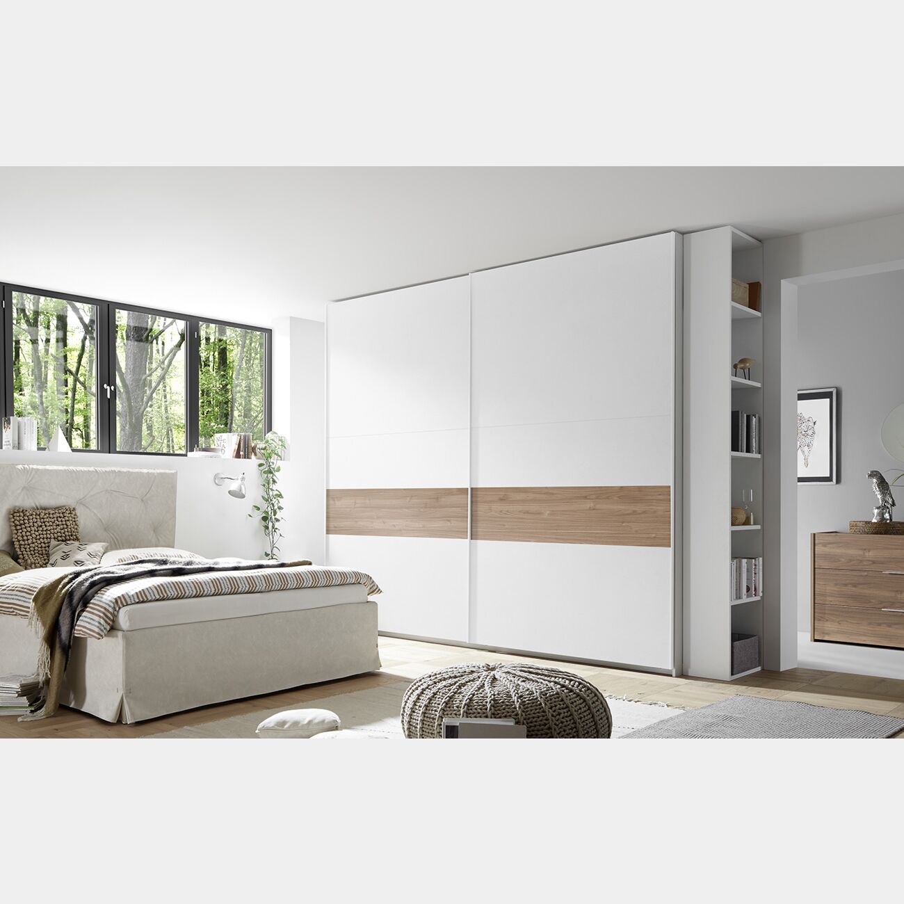 Armadio moderno con ante scorrevoli, Bianco Opaco e fascia Noce Stelvio