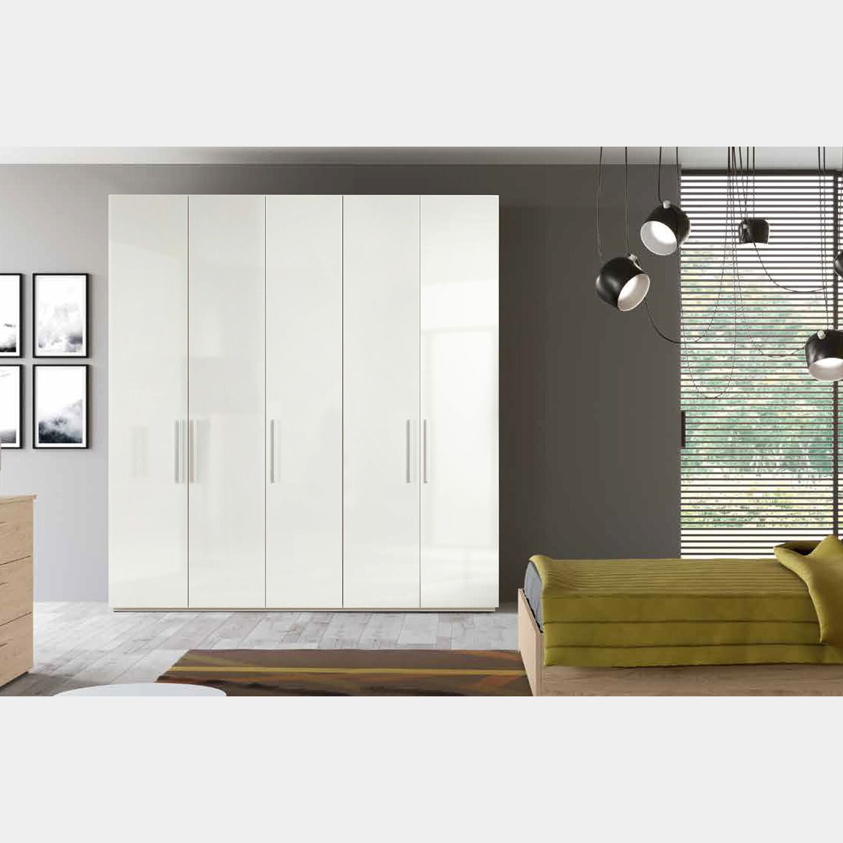 Pratico Armadio 5 ante battenti colore bianco lucido, adatto a camere moderne o di design.