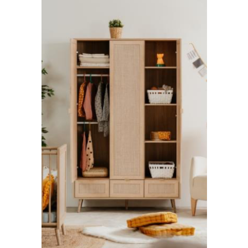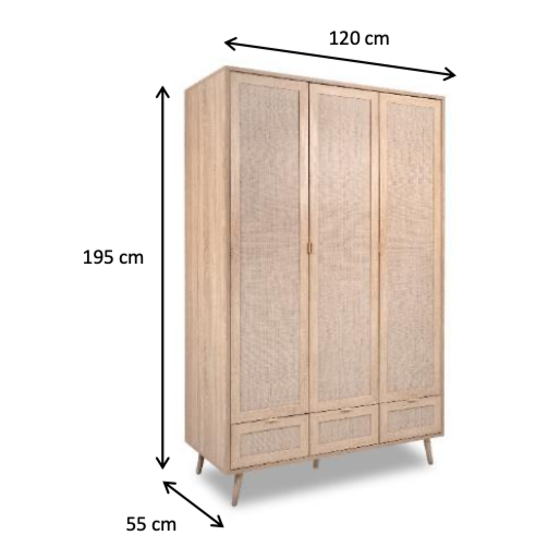 Armadio multiuso 3 ante 3 cassetti in finitura Quercia con pannello effetto Rafia