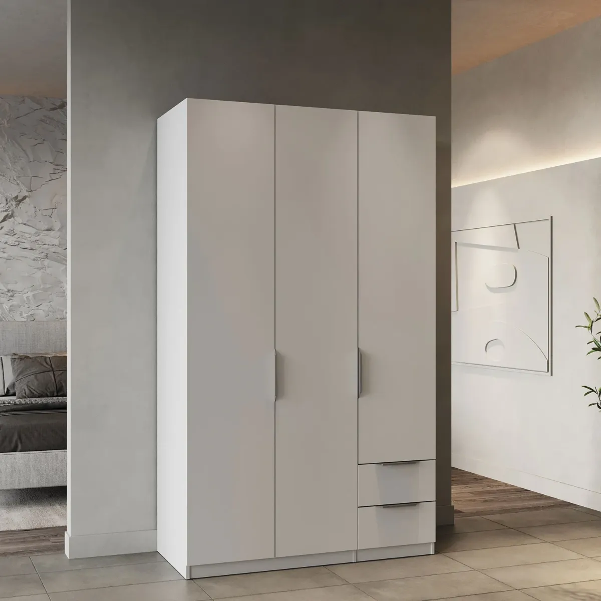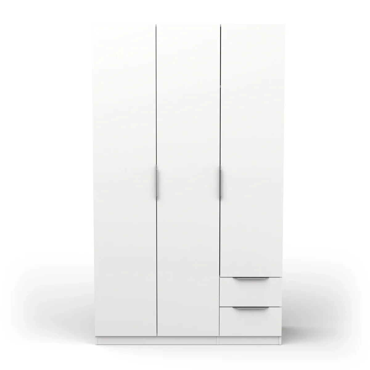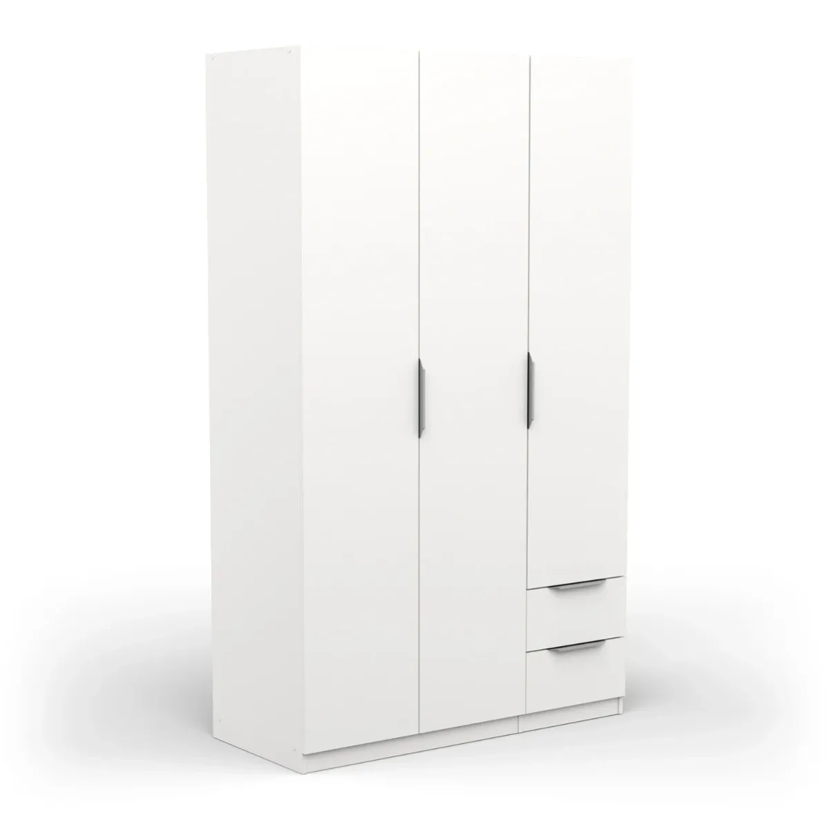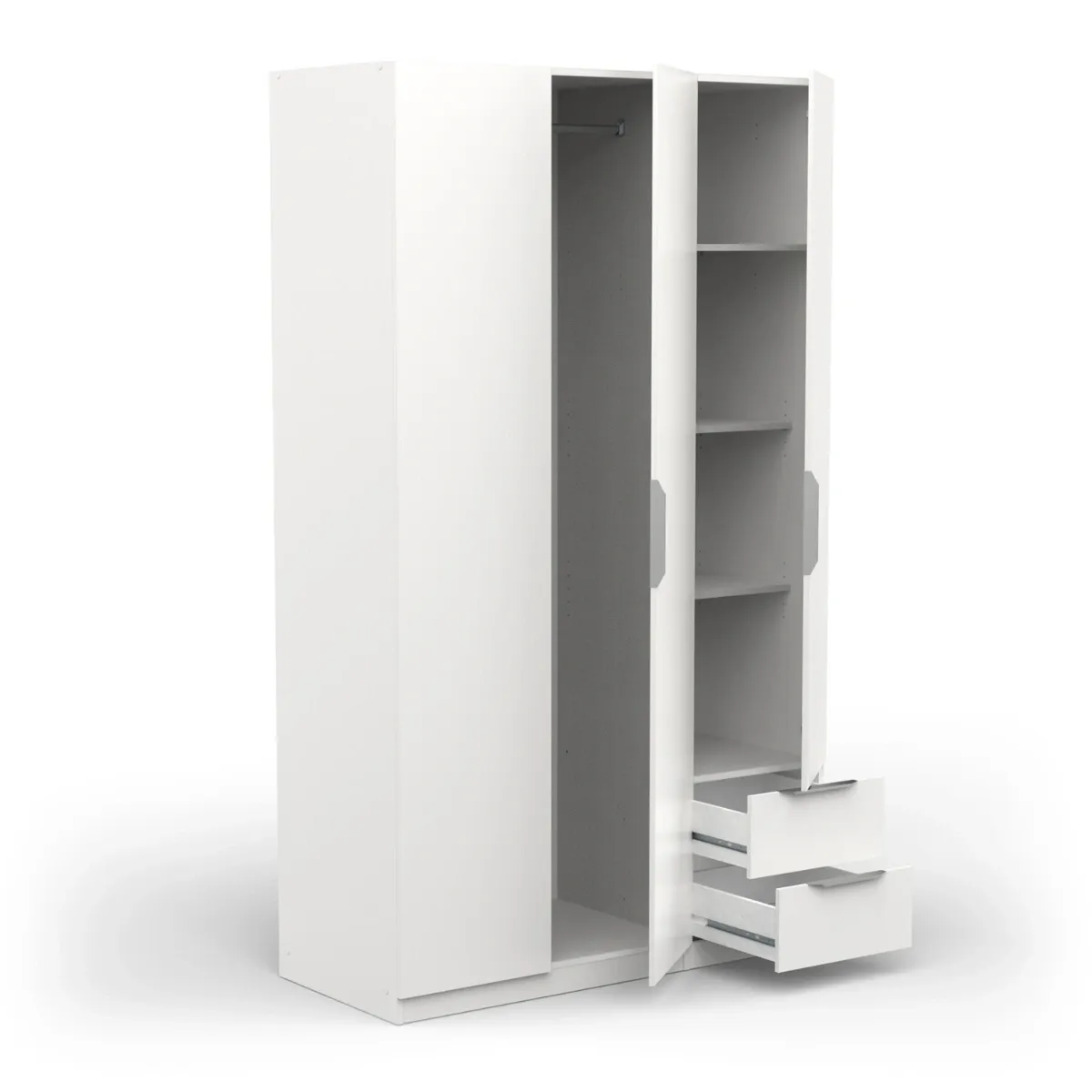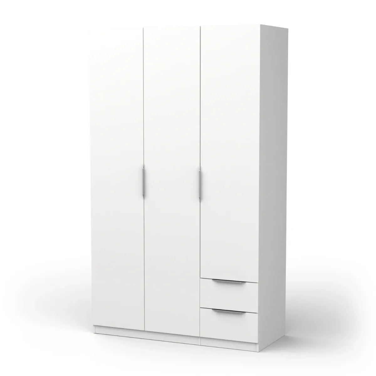 L'armadio, dotato di tre ante e due cassetti risulta un connubio perfetto tra estetica e praticità: la finitura Bianco opaco, le sottili maniglie ed il design pulito assicurano all'armadio una linea elegante; al contempo viene assicurato un ampio spazio contenitivo grazie alla suddivisione interna di ante e cassetti.