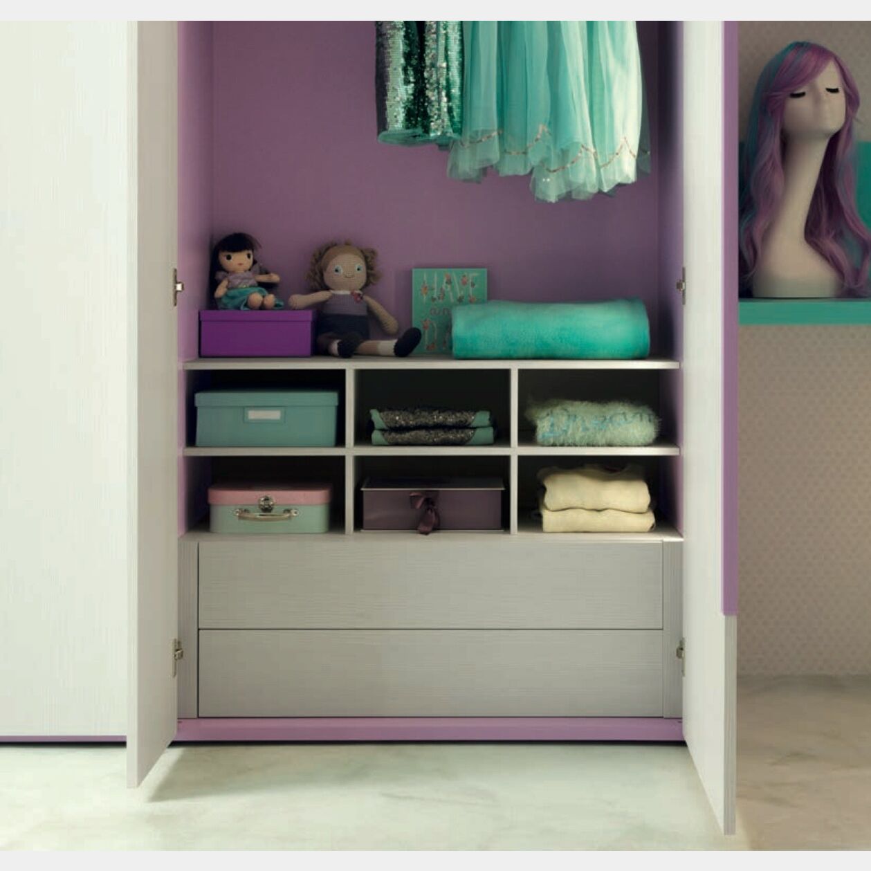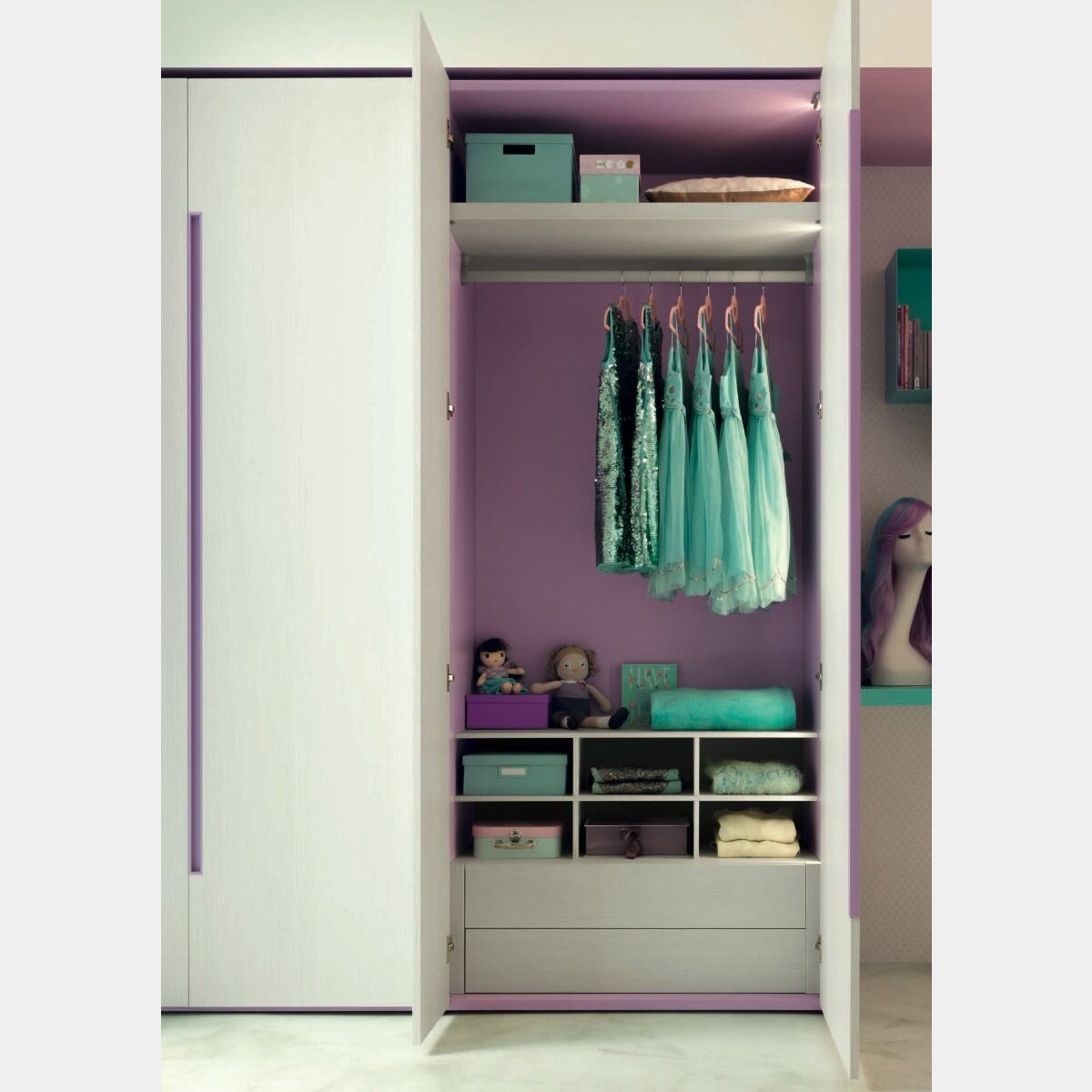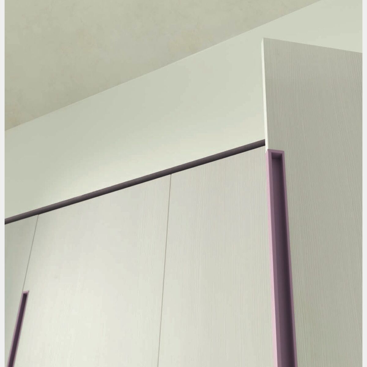 Creatività, innvazione e cura artigianale compongono la formula magica per realizzare un armadio speciale. Sia dentro che fuori sorprende per la bellezza, l'eleganza e l'armonia delle forme. I due moduli da 95 cm laccati integralmente colore lilla hanno frontali composti da ante in essenza betulla. Le maniglie risultano un dettaglio utile di stile che aggiunge valore all'intera composizione.
