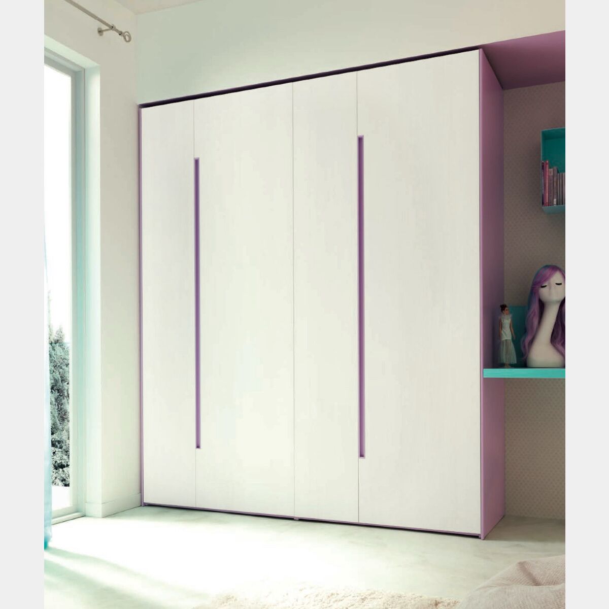 Armadio per bambini Moretti Compact, 4 ante Betulla e Lilla laccato