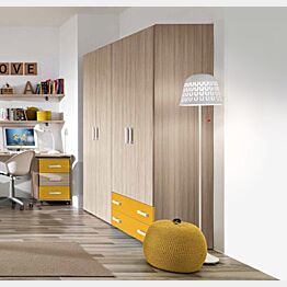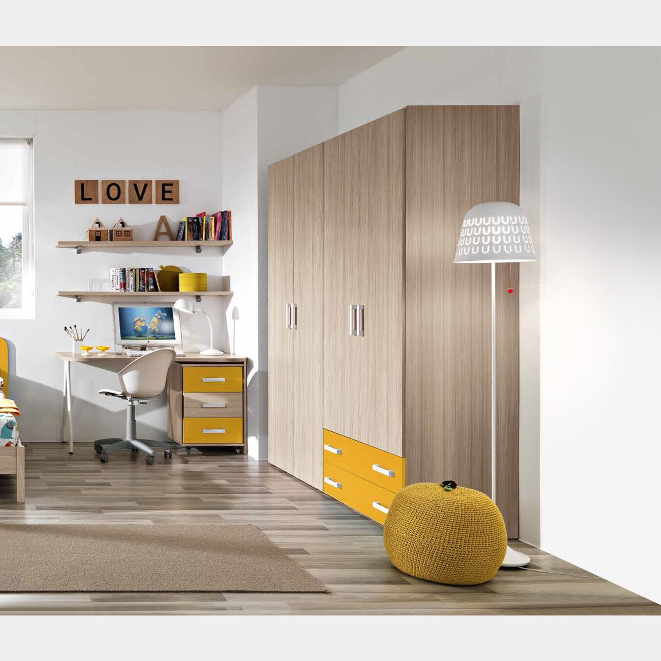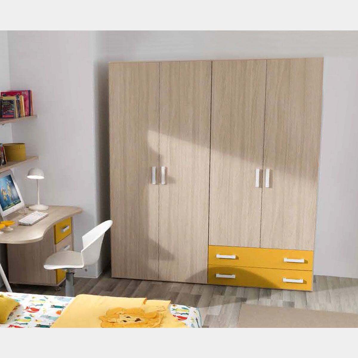 Armadio per camerette, 4 ante battenti 2 cassetti, olmo e giallo