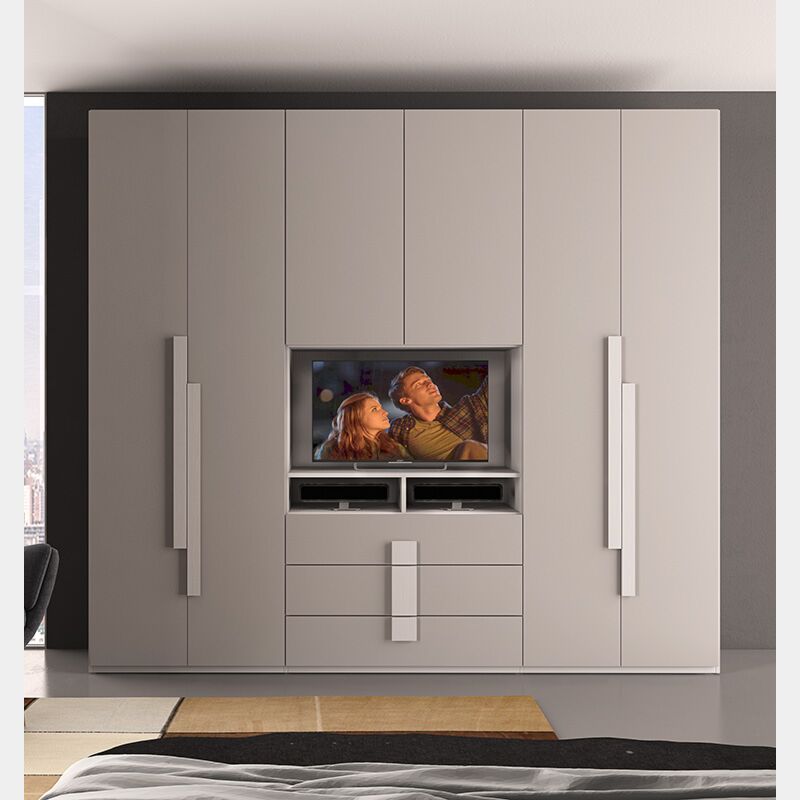 L'armadio è formato da 6 ante battenti in finitura Tortora e da 3 cassetti, l'armadio con vano Tv con un ripiano che genera 2 vani a giorno, l'ideale per posizionare letteori dvd e altri oggetti per la tv.