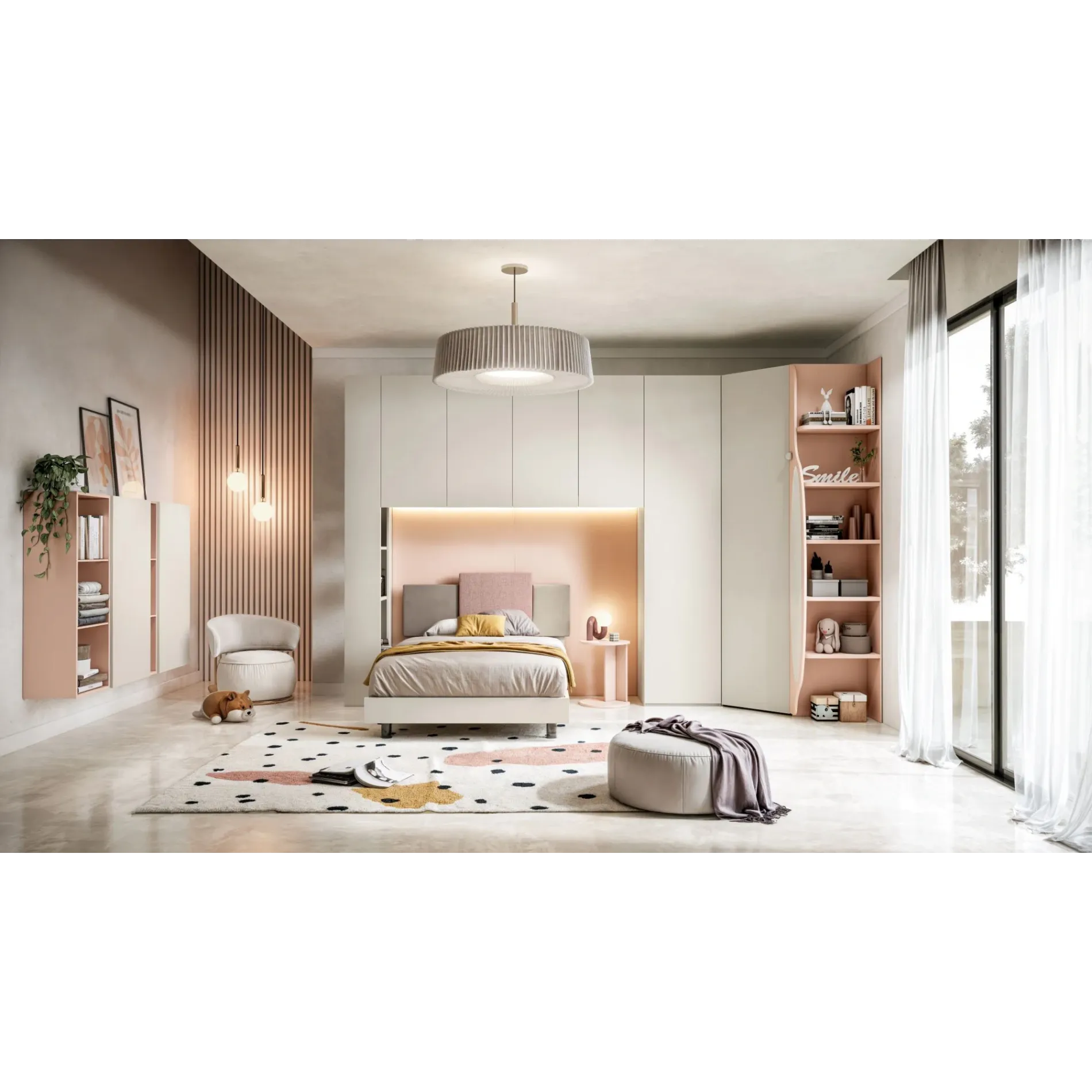 Le finiture proposte sono Nebbia e Peonia, tinte pastello che creano un piacevole gioco cromatico, donando alla cameretta armonia e calore.