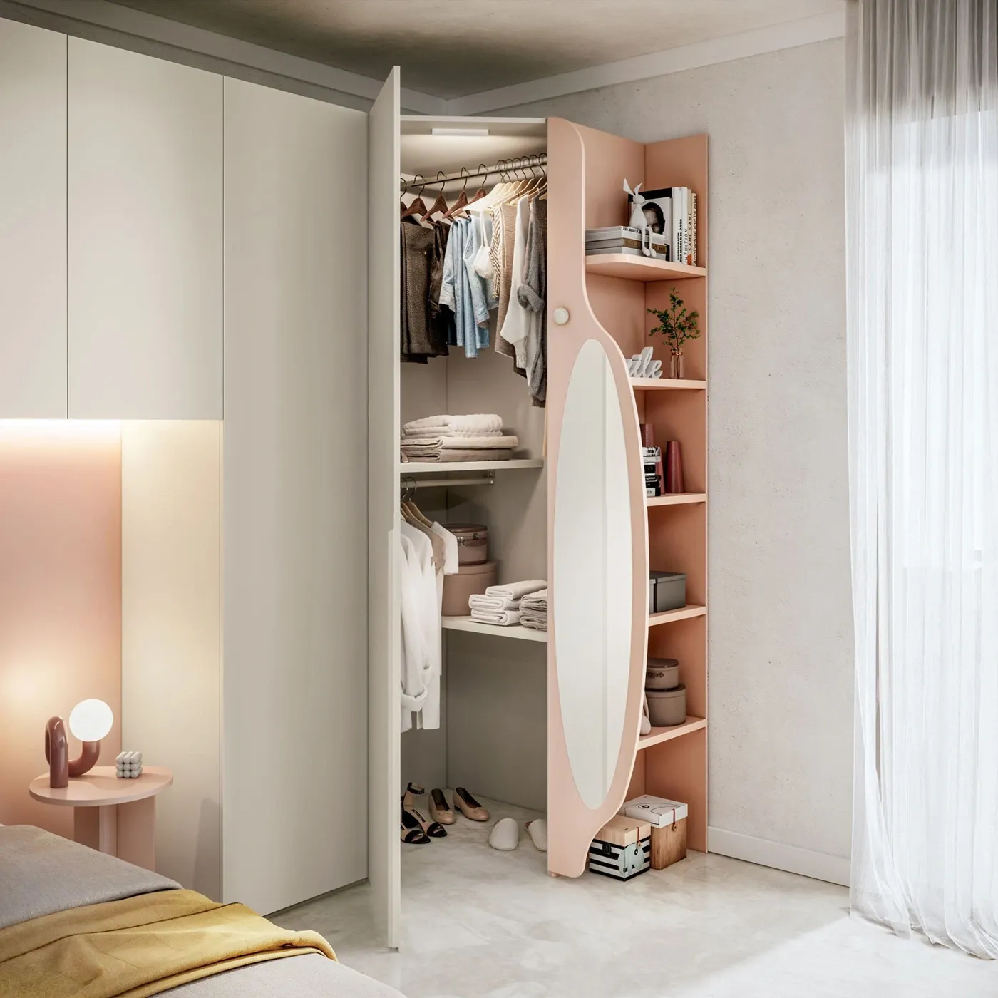 L'armadiatura prosegue con una cabina angolare ed un terminale con specchio, attrezzato anch'esso con 5 ripiani.