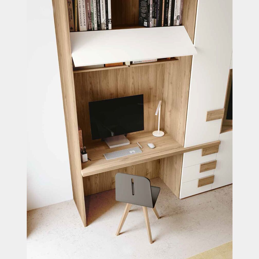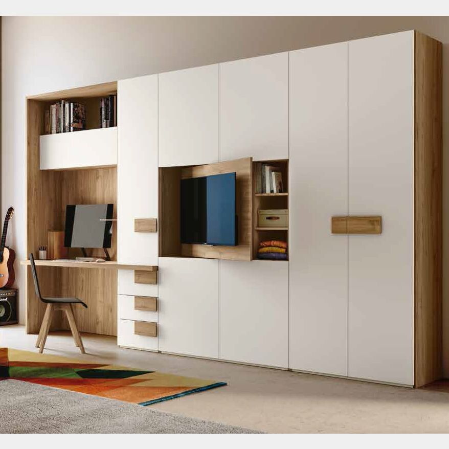L'armadio prevede vano tv orientabile per assicurare una corretta visione della televisione in tutte le direzioni, con una piccola libreria composta da 2 ripiani nel retro; una funzionale zona studio con pensile basculante e modulo con anta e 3 cassetti.