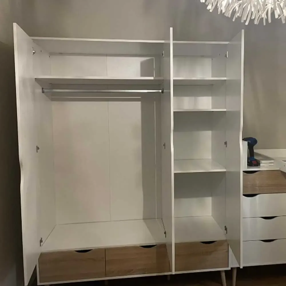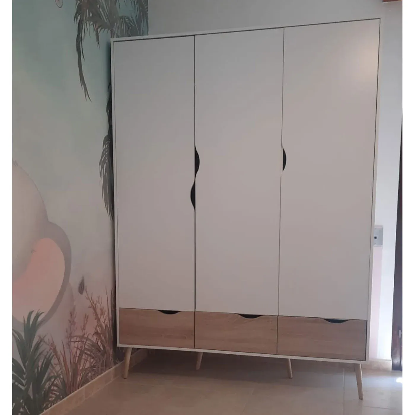 Elegante armadio colore Bianco e Rovere. L'armadio è molto capiente grazie ai suoi tre cassetti, alle ante e ai ripiani che lo compongono. Il suo design nordico è il prodotto della fusione tra la semplicità e la praticità. L'armadio si può inserire in una cameretta o anche in una camera da letto.