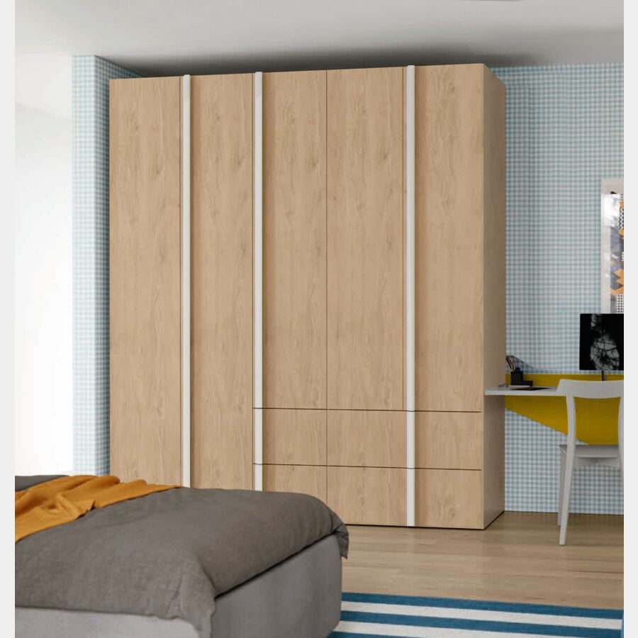 Una calda tonalità di Rovere, l'oak, personalizza l'armadio, consentendo una perfetta adattabilità a diverse camerette, sia per bambini che ragazzi. Le maniglie in Bianco opaco esaltano il design dell'armadio, sottolineandole l'alta qualità del Made in Italy.