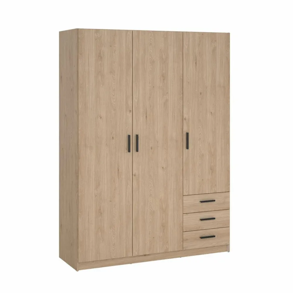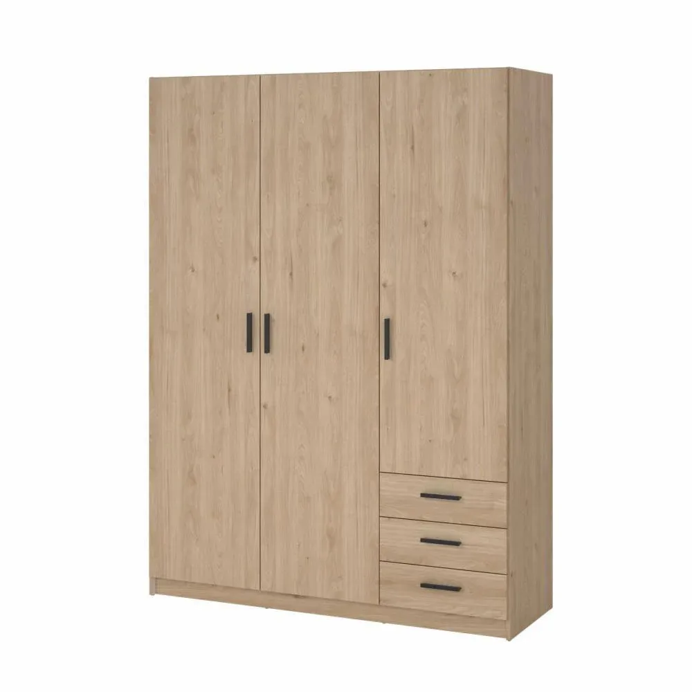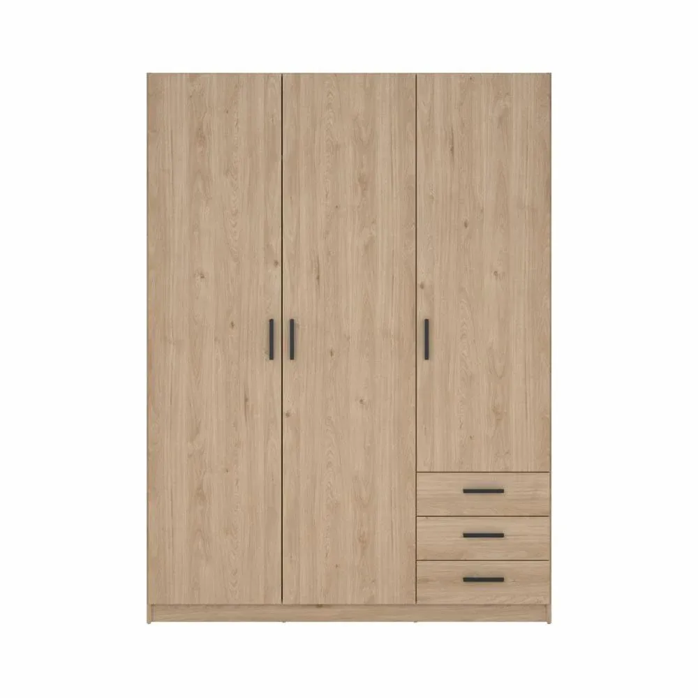 Armadio moderno e capiente in una finitura bellissima e molto fine ed elegante, Rovere. E' composto da tre cassetti in cui potete inserire i vostri vestiti al meglio in ordine, da tre ante battenti che sono caratterizzate da maniglie che garantiscono un facile accesso, da un tubo appendiabiti e da quattro ripiani.