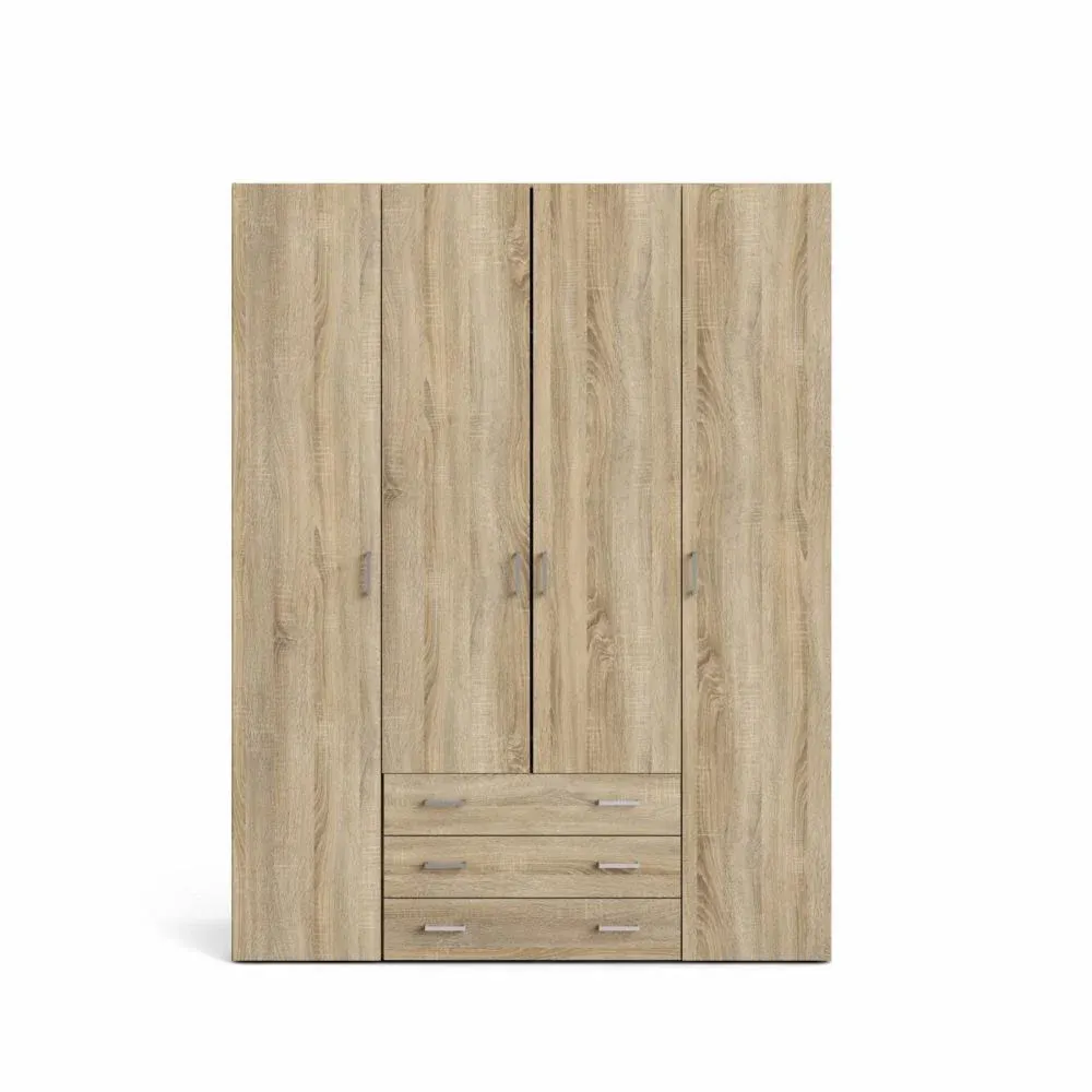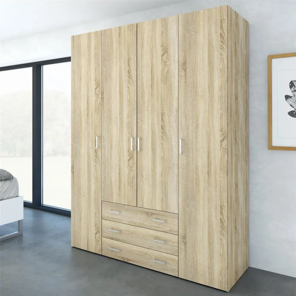 Nuovo armadio in finitura Rovere funzionale, lineare e chic. E' disponibile anche in Bianco e Bianco lucido. Si rivela capiente grazie alle sue 4 ante e 3 cassetti.