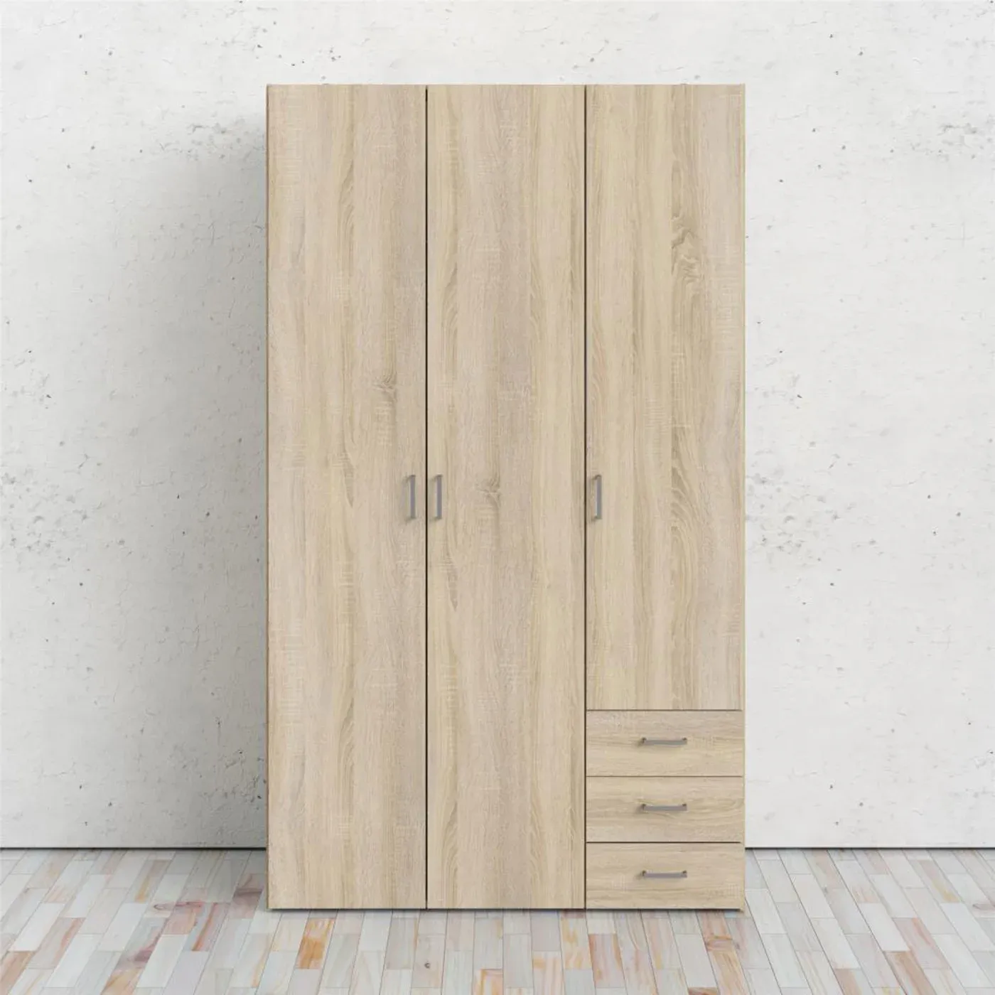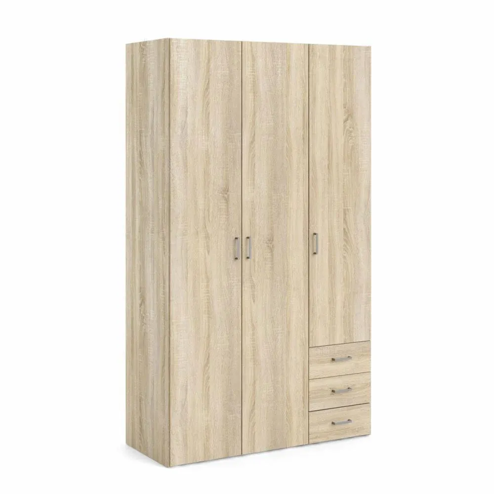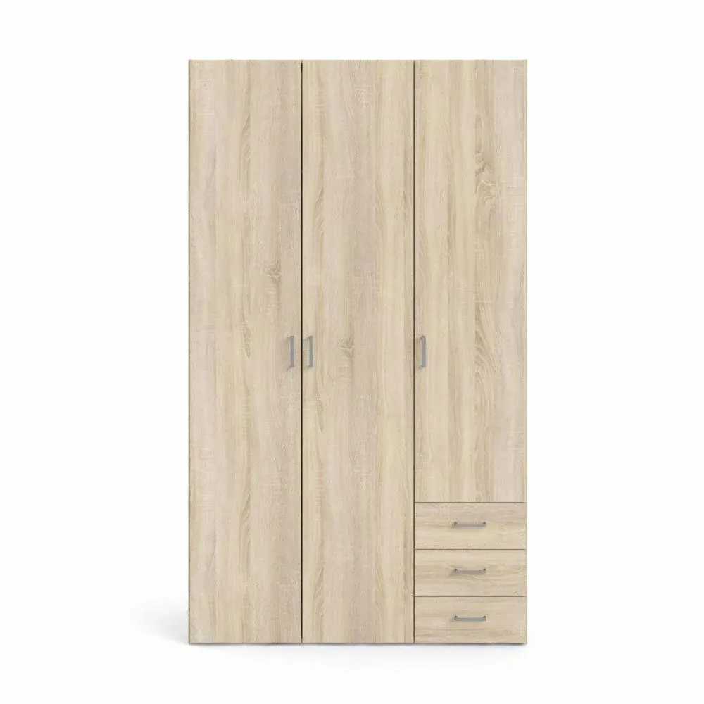 Armadio semplice, elegante e tenue in finitura Rovere. Oltre ad essere molto bello esteticamente da vedere si rivela molto spazioso in quanto è ben strutturato per riporre i propri vestiti in ordine. E' composto da tre ante battenti caratterizzate da maniglie che garantiscono un facile accesso, da tre cassetti, da cinque ripiani e da un tubo appendiabiti.