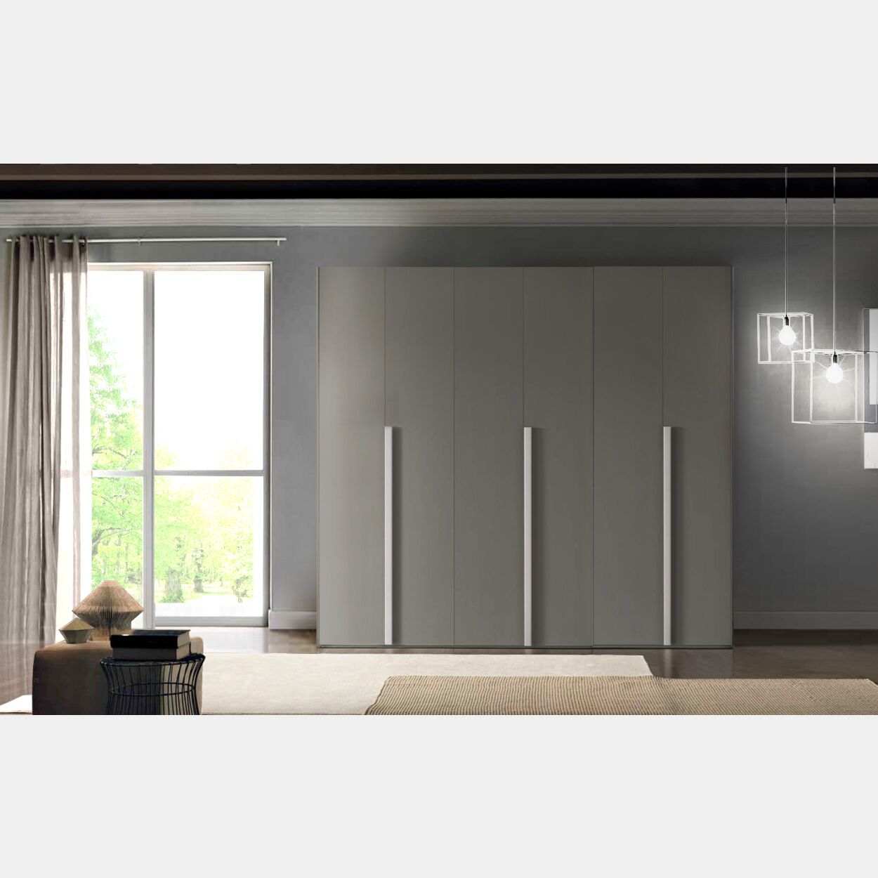 La finitura in Grigio londra contrasta quella delicata in Noce bianco presente nelle maniglie, il gioco di colori che si crea dona carattere all'ambiente, rendendo l'armadio protagonista della stanza da letto.