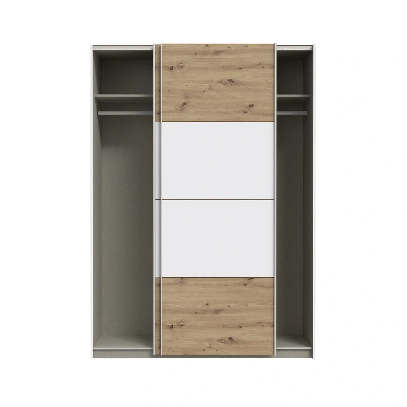 L'armadio è proposto con struttura bianca e frontali rovere. Durante il montaggio è possibile scegliere la finitura dei pannelli centrali, rifiniti in bianco da un lato, in rovere dall'altro.