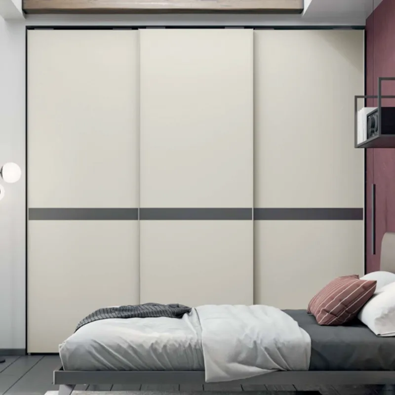 L'armadio presenta un design semplice e pulito, che viene valorizzato da una fascia orizzontale che percorre la larghezza delle tre ante, creando un netto contrasto con frontali e struttura.