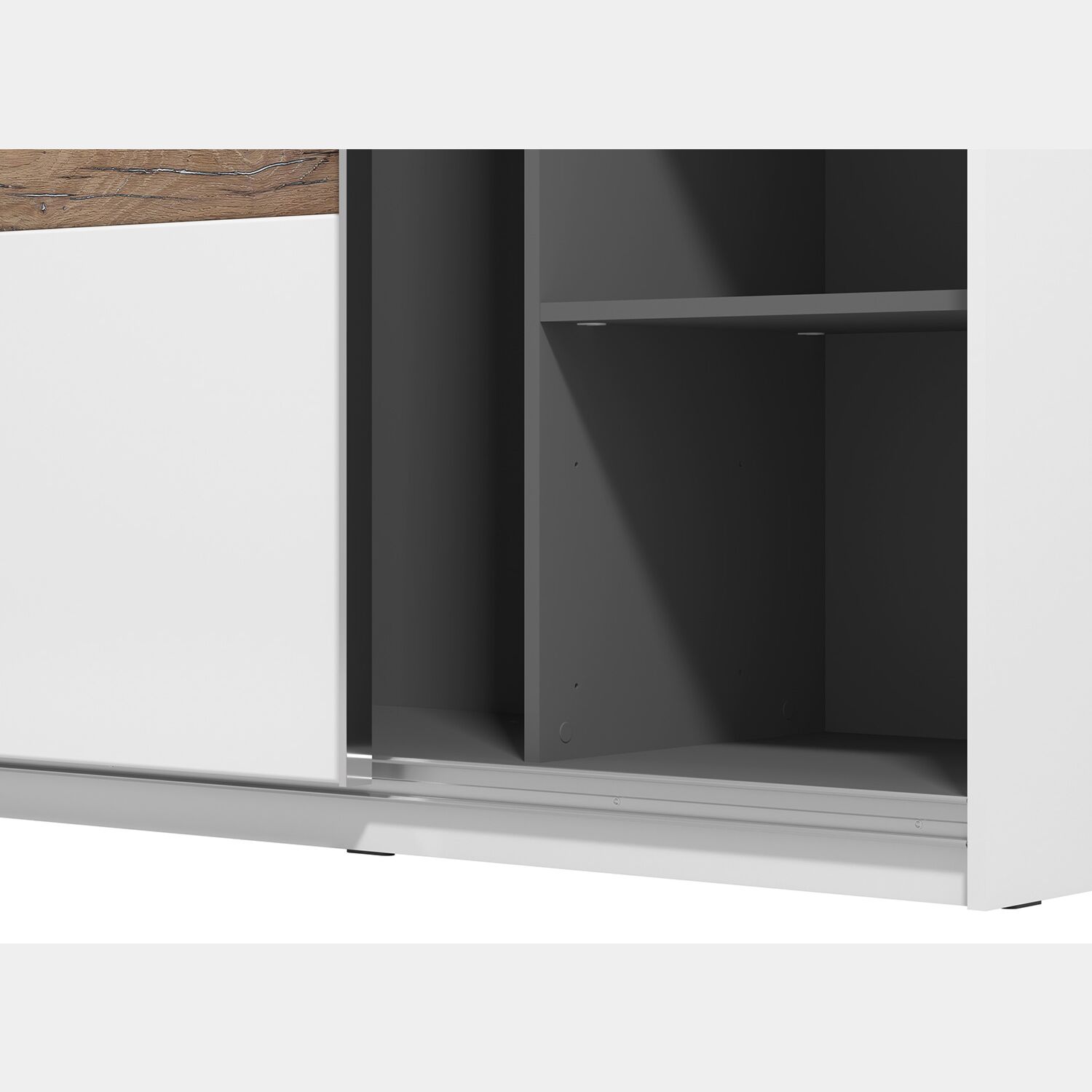 L'elegante finitura bianca che caratterizza l'armadio scorrevole viene spezzata nei frontali da una larga fascia quercia che, grazie alle sfumature caratteristiche, dona alla camera da letto calore e armonia.