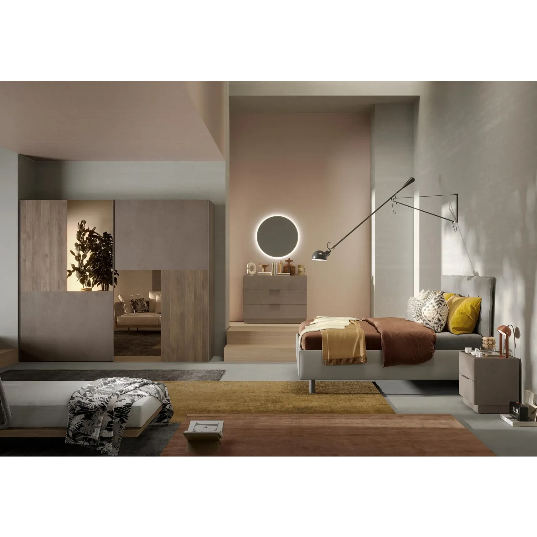 Le due grandi ante scorrevoli dell'armadio sono caratterizzate da specchi bronzati accompagnati da inserti in tinta Mercure, che ben si accostano alla finitura Bronzo della struttura.