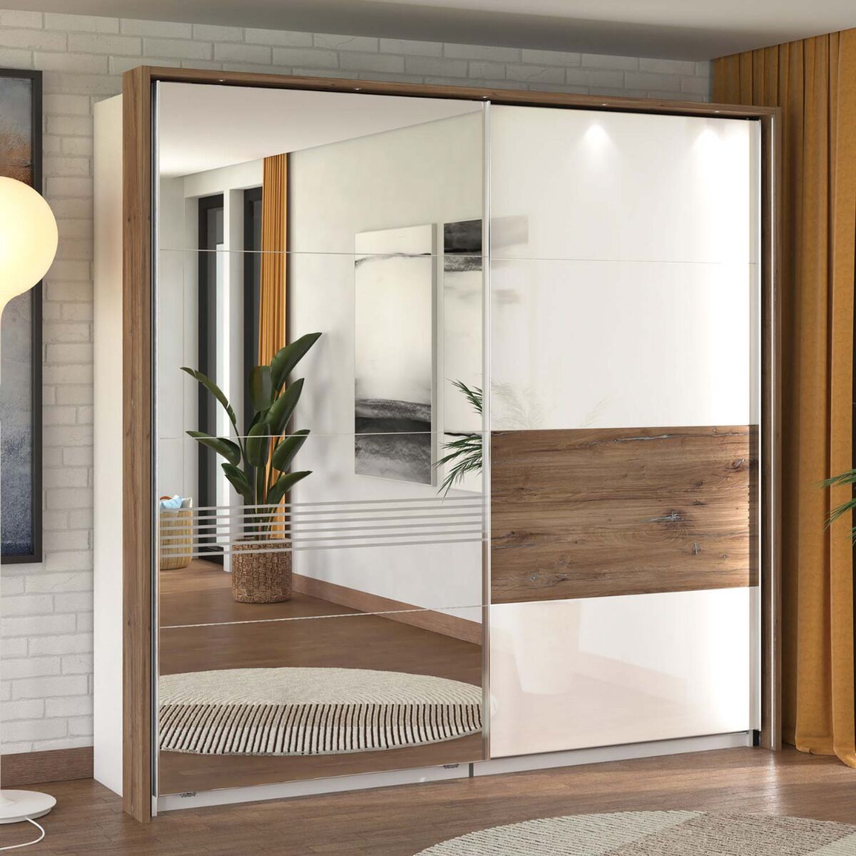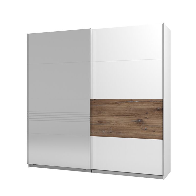 L'armadio presenta due ante scorrevoli, la finitura bianca viene spezzata nell'anta di destra da una fascia quercia con sfumature, mentre l'anta di sinistra è dotata di uno specchio neutro con sottili inserti orizzontali al centro.