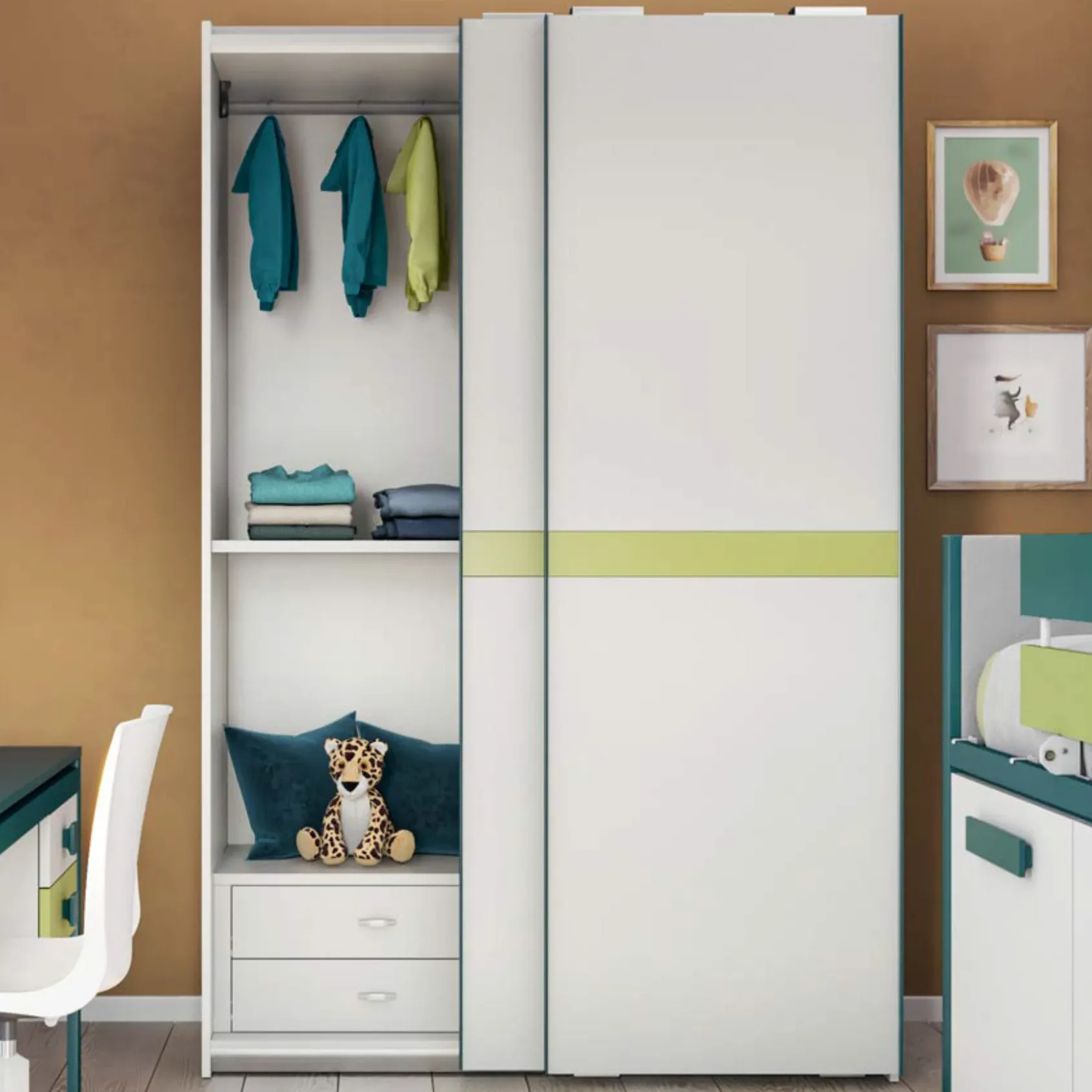 Progettato per la cameretta dei bambini l'armadio a due ante scorrevoli presenta un design moderno ed elegante, che viene valorizzato da accesi inserti.