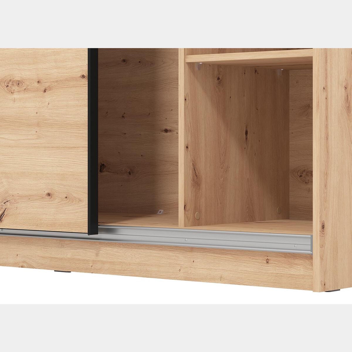 L'armadio presenta uno stile industriale, caratterizzato d auna calda finitura Rovere che viene contrastata da dettagli neri presenti nei profili e nei frontali delle ante.