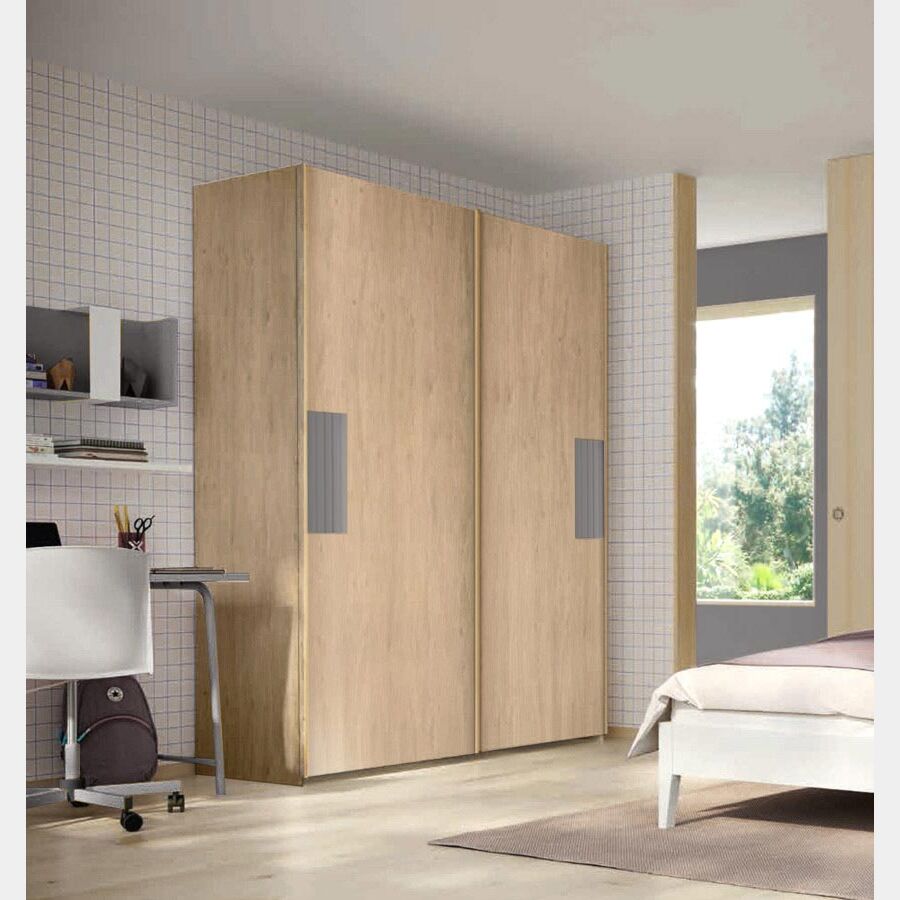 L'armadio scorrevole presenta una linea pulita valorizzata da due inserti posti nei frontali. La finitura in Rovere oak assicura alla cameretta calore e luminosità, per renderla accogliente ed elegante. Il Grigio titanio posto negli inserti rettangolari delle ante assicura un contrasto netto di impatto, per catturare l'attenzione e consentire all'armadio di emergere nella camera da letto.