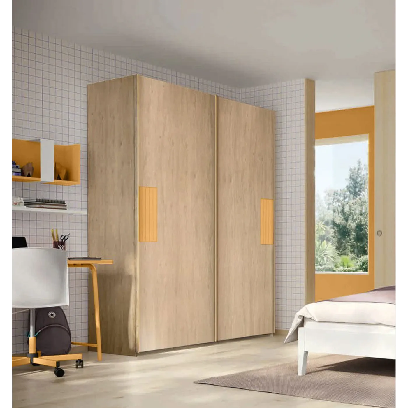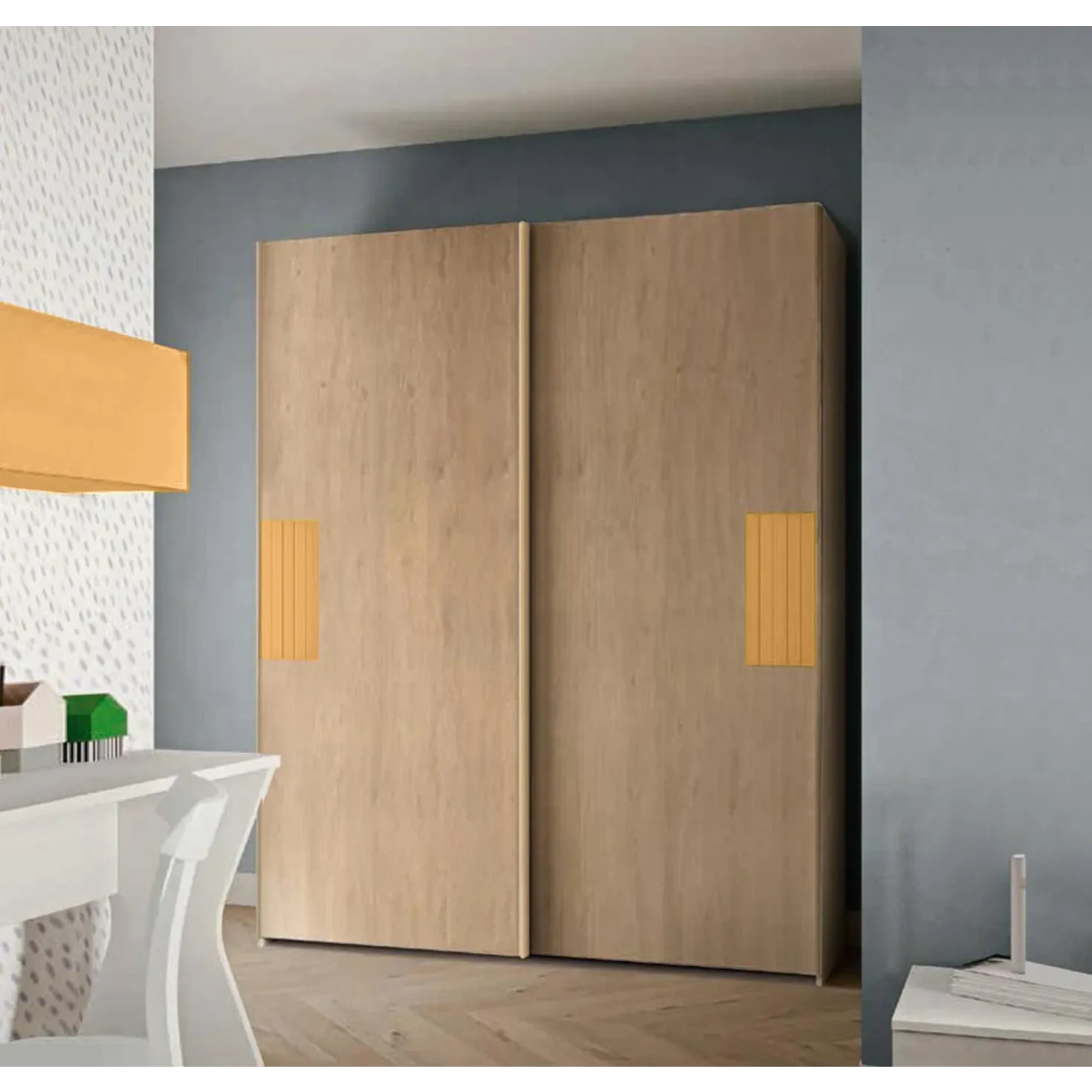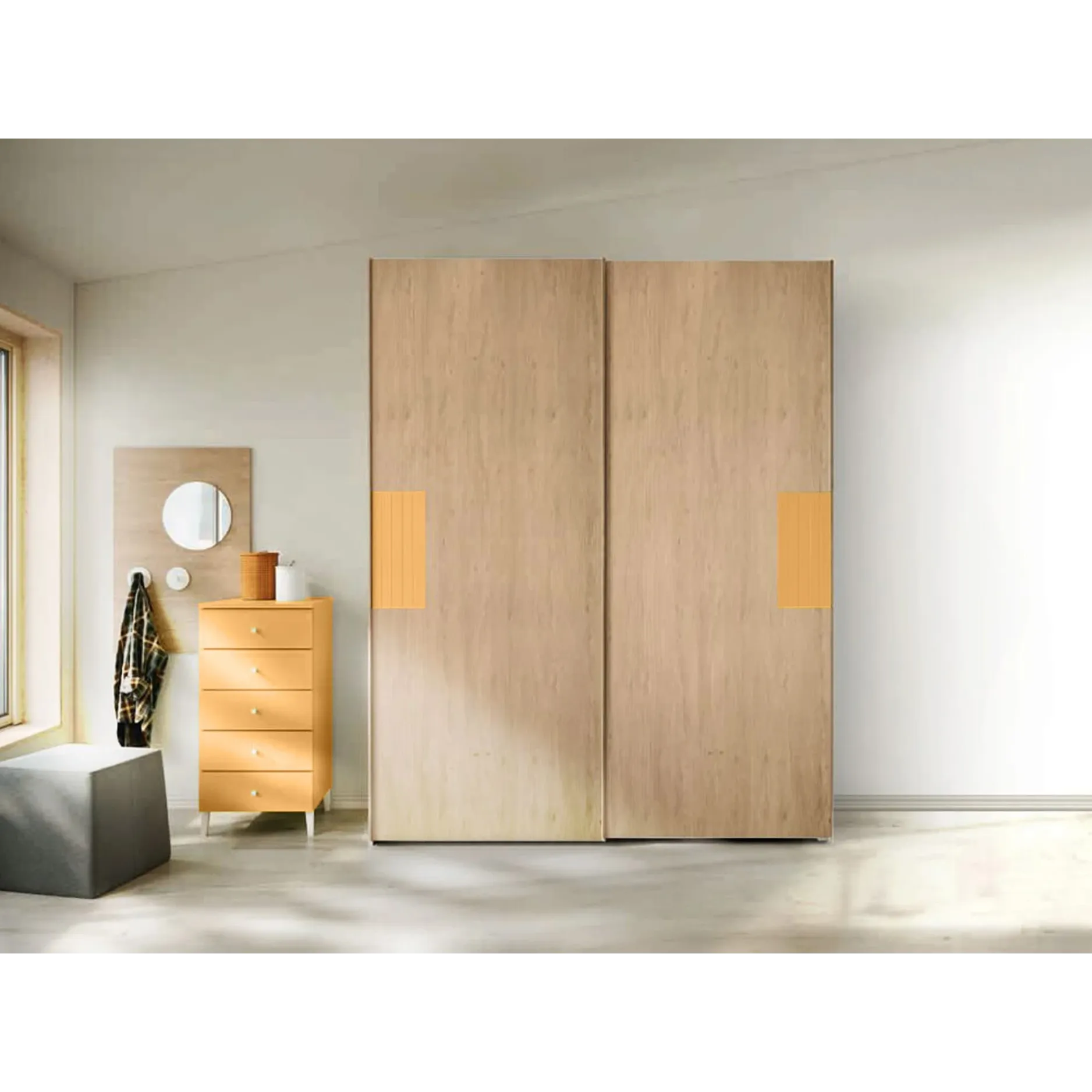 A dare un tocco allegro e su misura di bambino sono gli inserti posti nei frontali delle ante in finitura Giallo zafferano, l'accesa finitura cattura l'attezione riservando un posto speciale all'armadio nella cameretta. Grazie ad un ampio campionario di finiture disponibili è possibile creare contrasti accesi e divertenti, in perfetta sintonia con il proprio stile e arredo.
