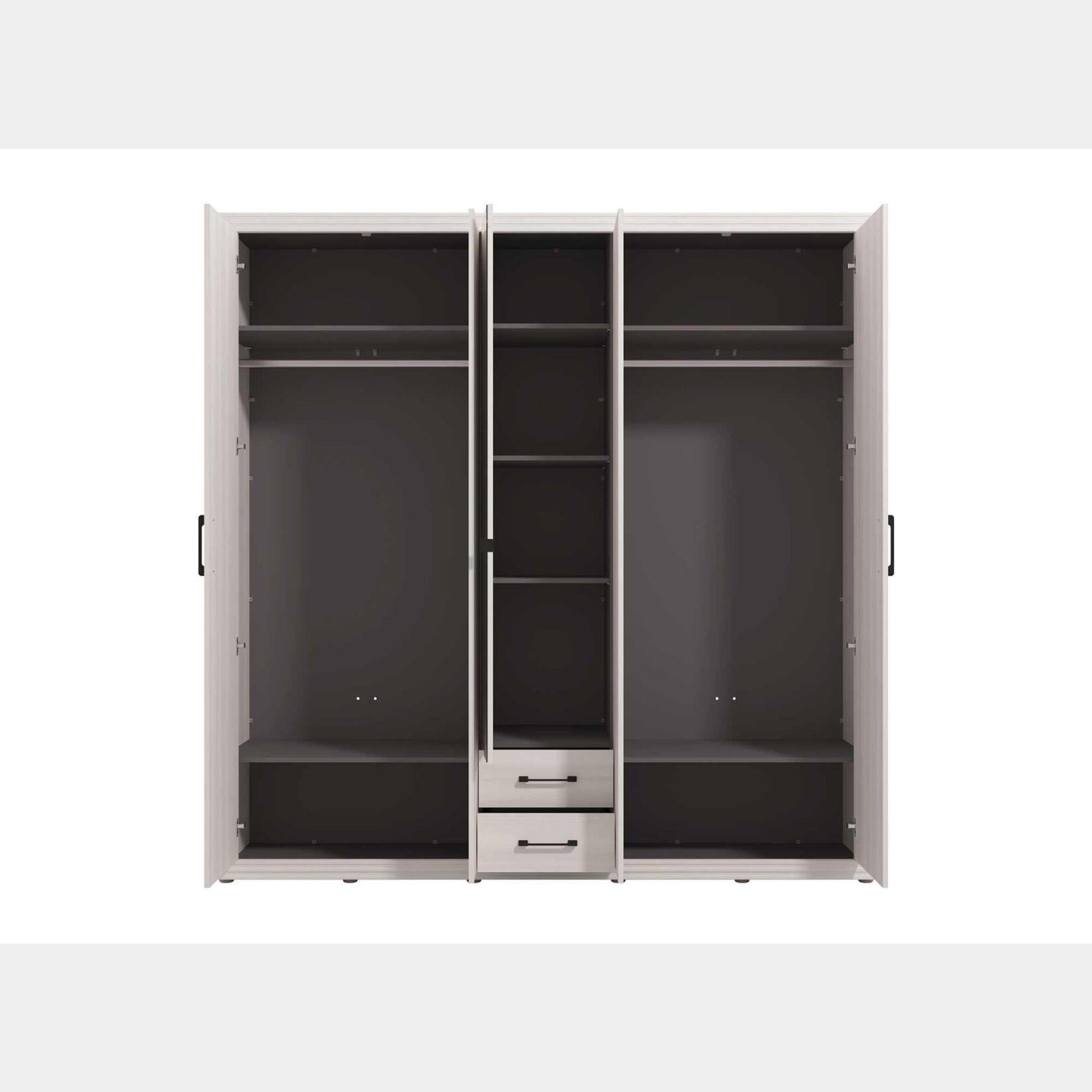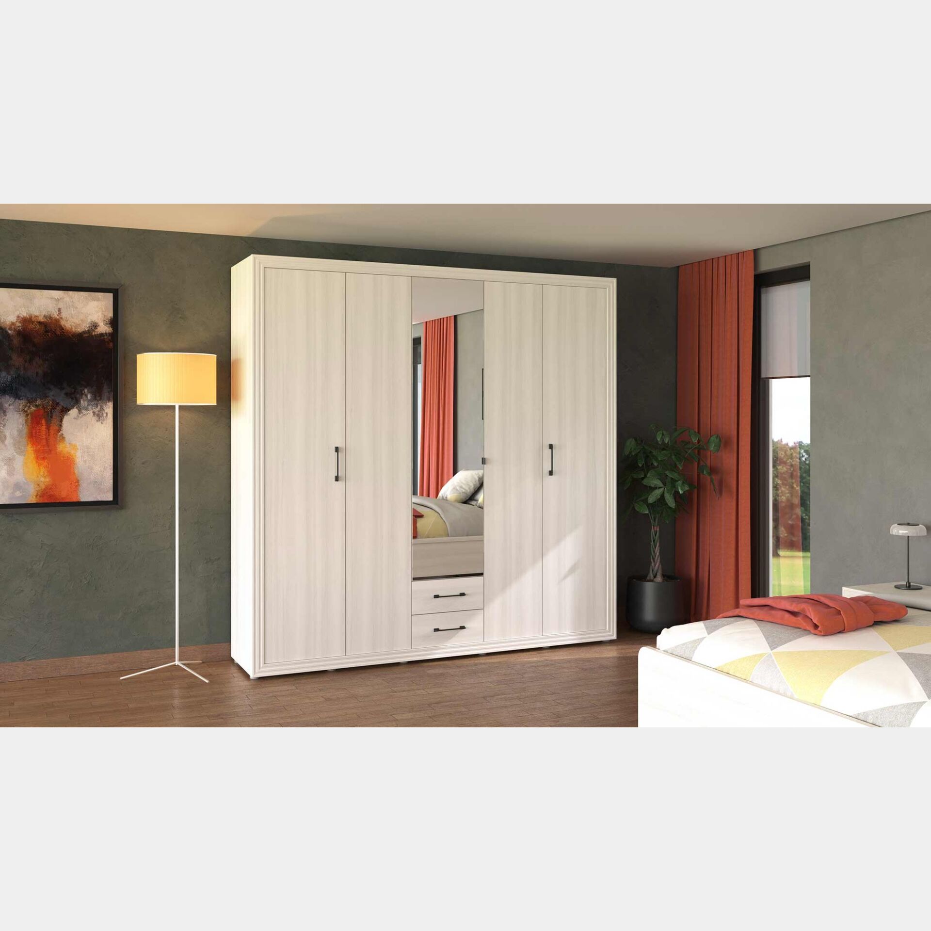 Pratico e confortevole, l’armadio contemporaneo è composto da: cinque ante battenti e due cassetti con all'interno sette ripiani e due aste appendiabiti; spazio ideale per organizzare al meglio tutti gli indumenti e la biancheria della camera da letto.