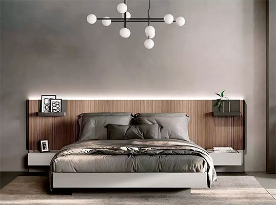 Forme e materiali sono state studiate per rendere speciale la camera da letto; il particolare design della testata cattura l'attenzione facendo diventare il letto protagonista indiscusso della zona notte. La finitura in essenza, Noce moro, presenta delle gradevoli venature che rendono caldo e accogliente l'ambiente.