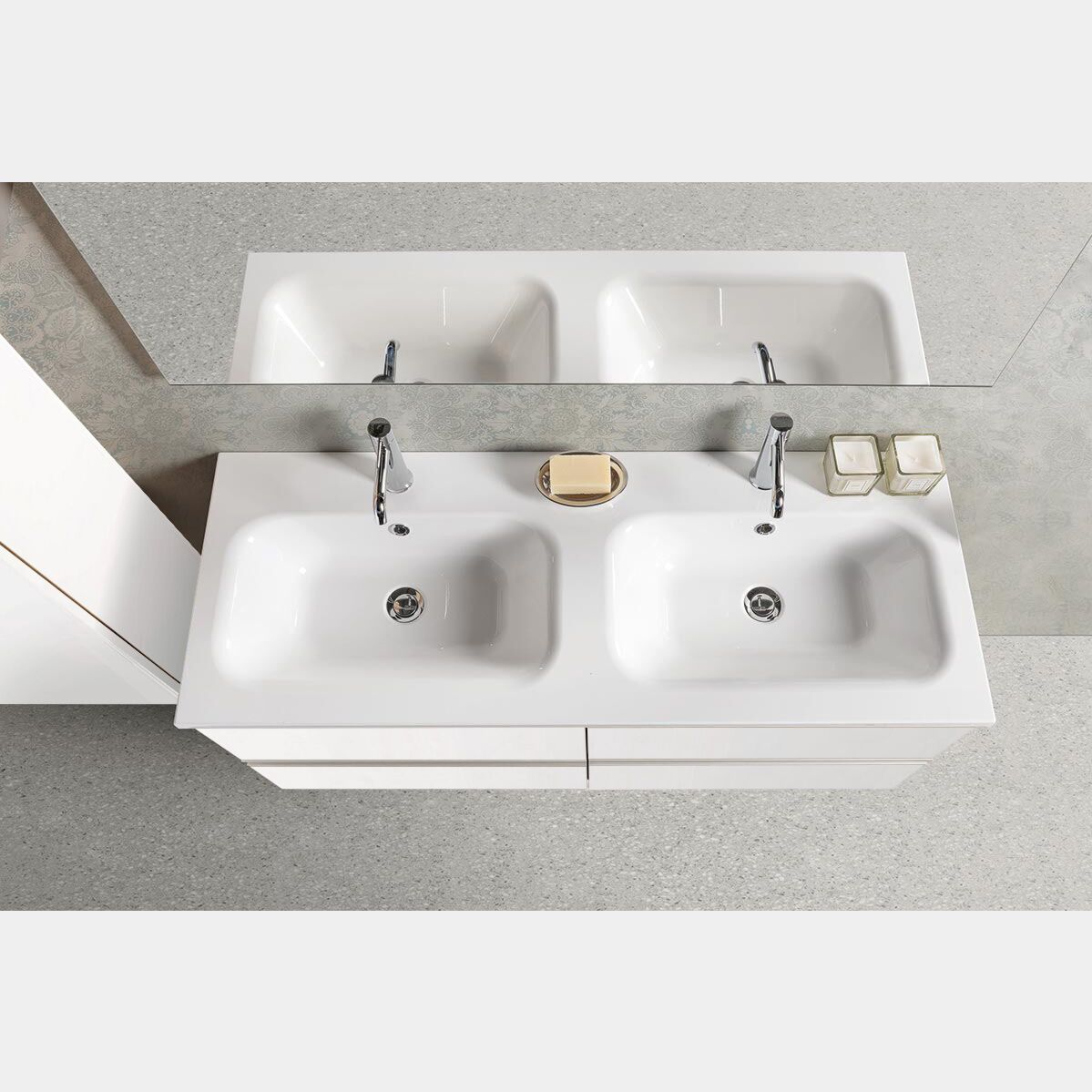 Il mobile bagno sospeso è un'alternativa ai classici prodotti, dotati infatti di 2 lavabi e 4 cassetti fornisce un ampio spazio di appoggio per un utilizzo quotidiano. Il mobile da bagno è nella finitura Bianco Opaco.