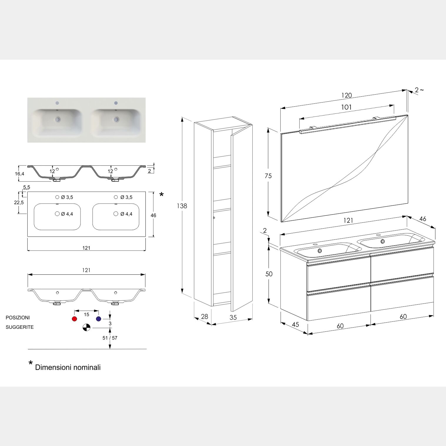 Il mobile bagno viene fornito con il lavabo integrato in solid surface, in finitura bianco lucido con troppopieno e foro miscelatore. Come optional è possibile richiedere lo specchio rettangolare, la lampada con illuminazione LED a basso consumo di energia, IP44, potenza 5W e la colonna sospesa dotata di 3 ripiani interi e antas con meccanismo apertura/chiusura ammortizzata.
