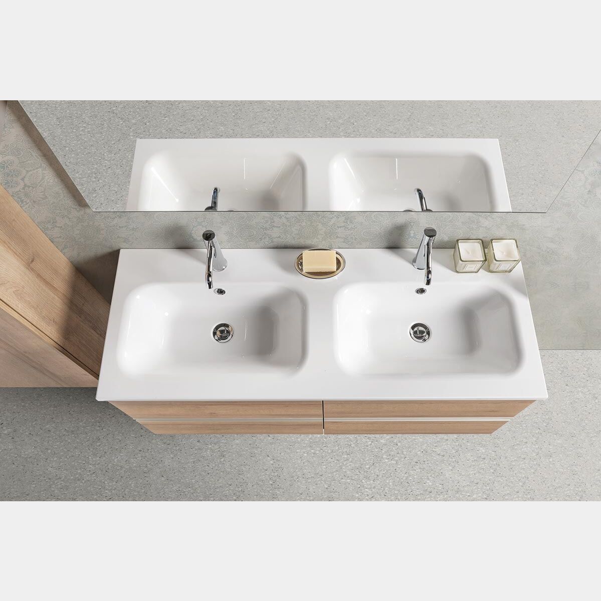 Il mobile bagno sospeso è un'alternativa ai classici prodotti, dotati infatti di 2 lavabi e 4 cassetti fornisce un ampio spazio di appoggio per un utilizzo quotidiano. Il mobile da bagno è nella finitura Rovere farnia.