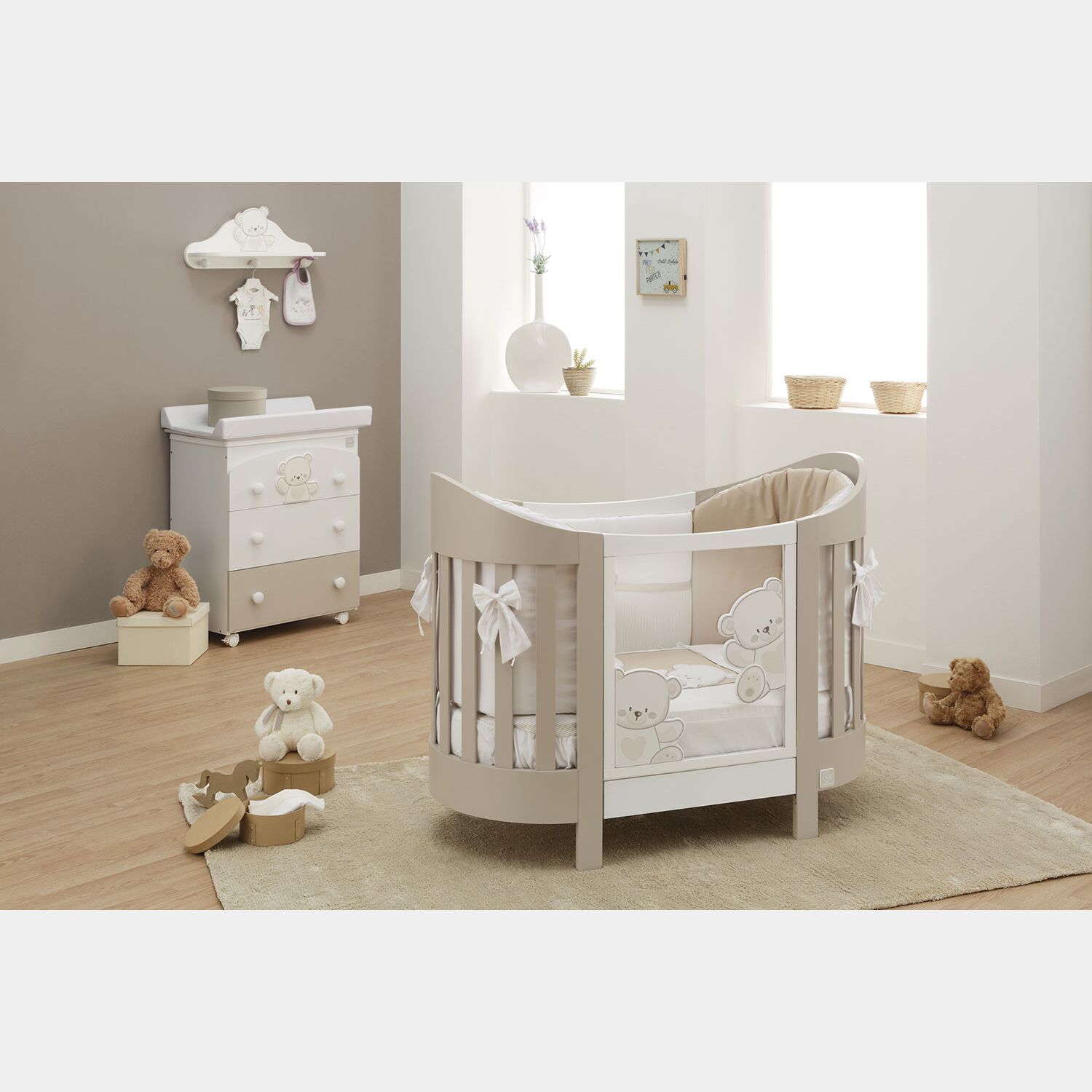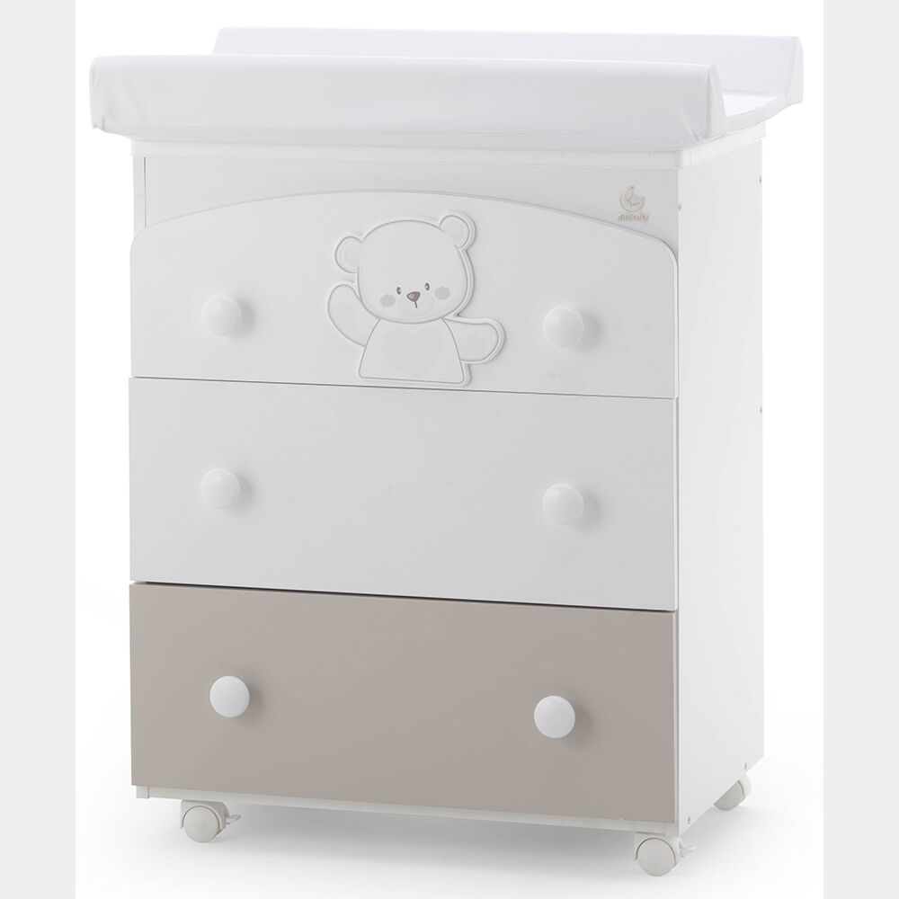 Il bagnetto è dotato di 3 cassetti, quello inferiore è verniciato choco mentre i due superiori sono bianchi, nel primo cassetto è presente un decoro orsetto, con profili choco. Il bagnetto Mr.Bear è disponibile anche nella finitura Bianco e Grey.