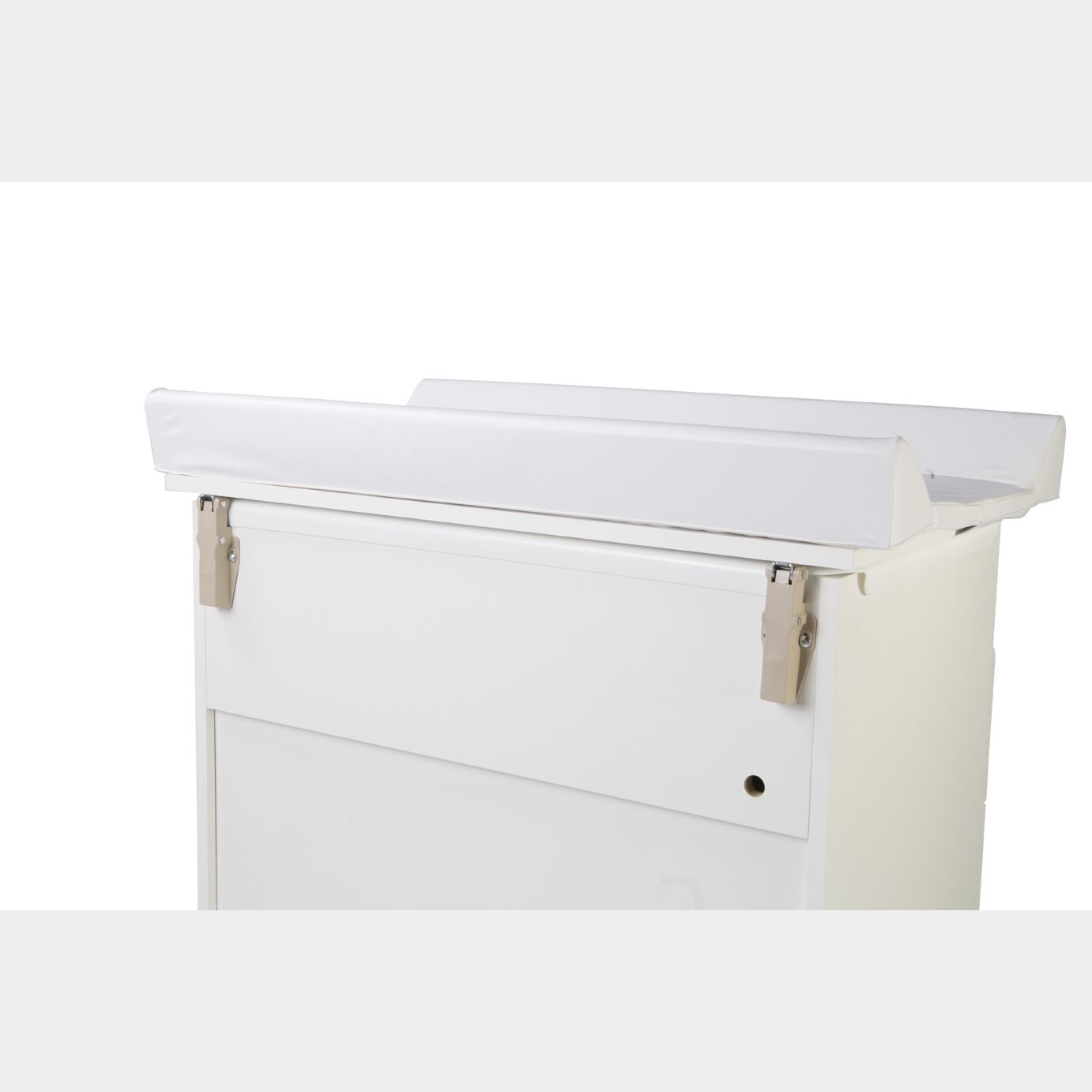 Il bagnetto viene fornito con una vaschetta a 2 posizioni, tubo di scarico, fasciatoio in pvc con 2 sponde bianco, angoli top gommati e arrotondati, cerniere posteriori a rallentamento.