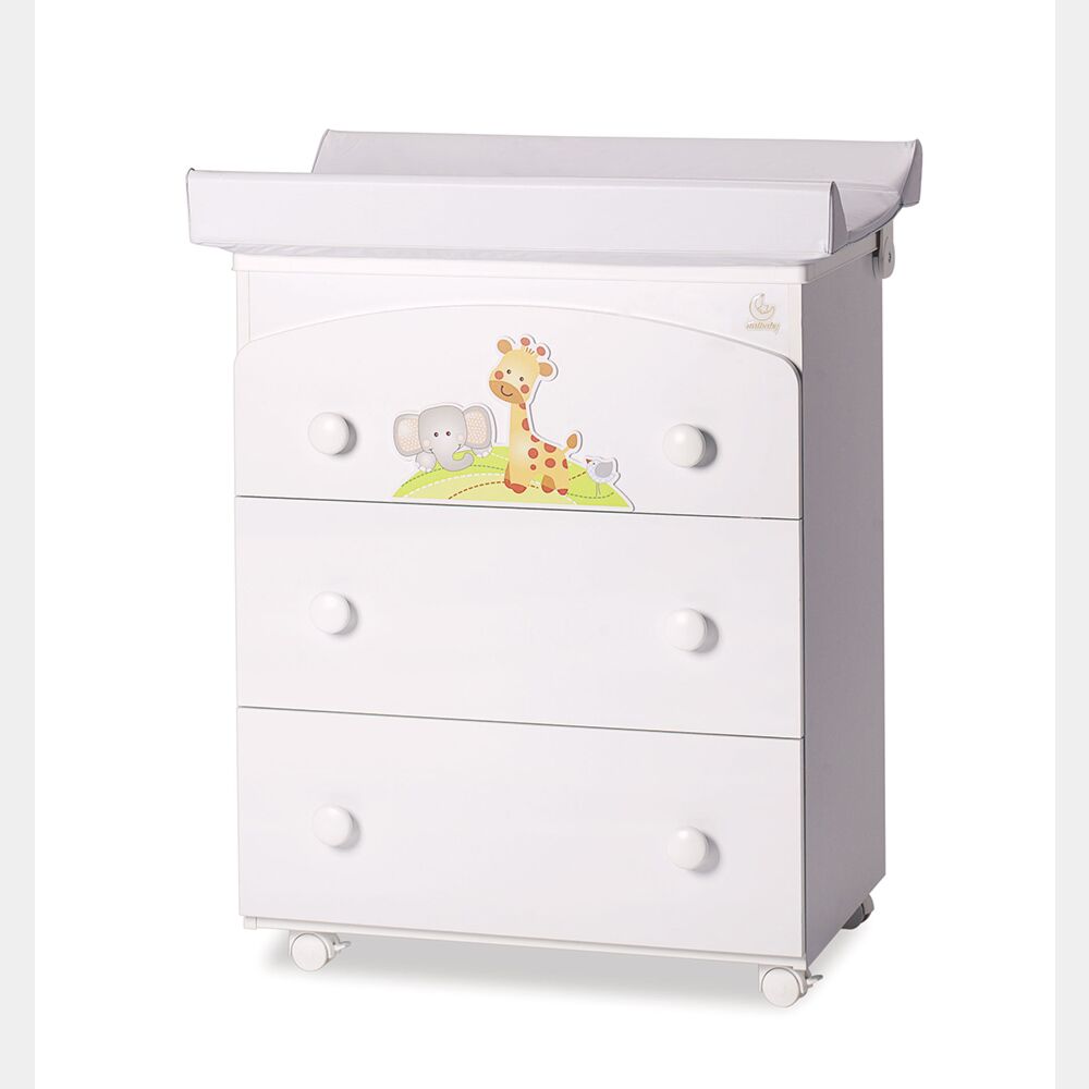 Il bagnetto è dotato di 3 cassetti con pomelli, la finitura è bianca con decori colorati nel primo cassetto. Prodotto certificato e costruito secondo la norma EN 12221, MADE IN ITALY.