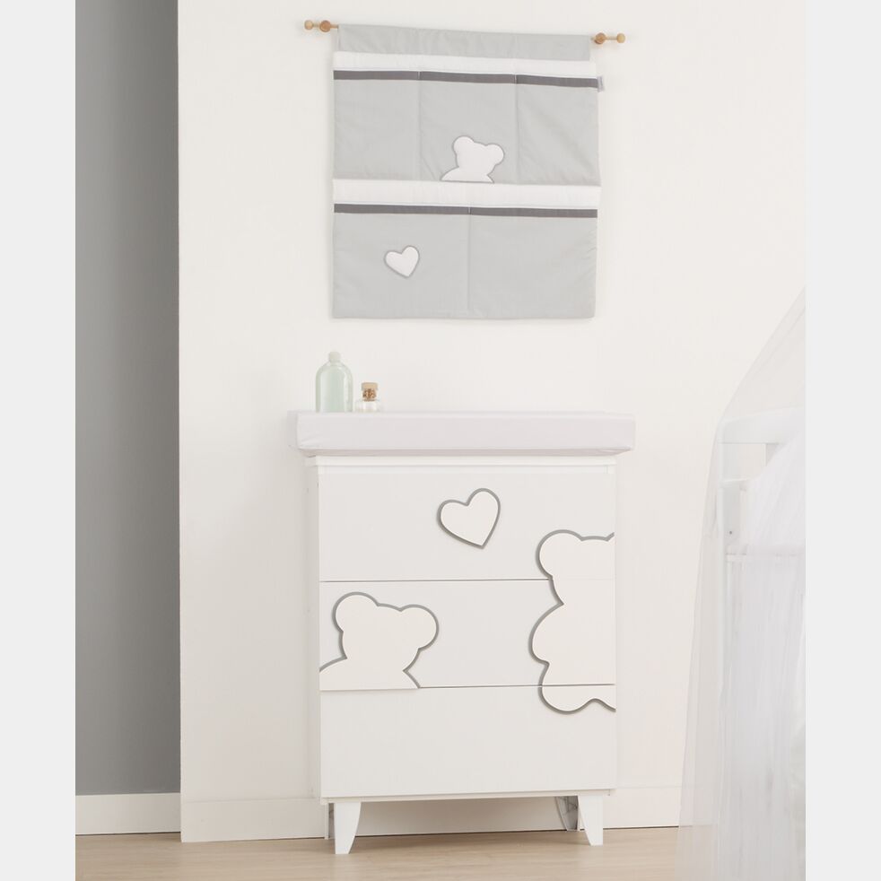 Il piano cambio è costituito da un morbido materassino con tasca di sicurezza, rivestito in tessuto plastico in PVC atossico e senza ftalati, lavabile e igienico. Le due sponde alte assicurano la massima sicurezza per il neonato. E' possibile richiedere tramite apposito configuratiore il fasciatoio in PVC con sponde 2 lati bianco e grigio con fantasia (L.81 H.9 P.49 cm).