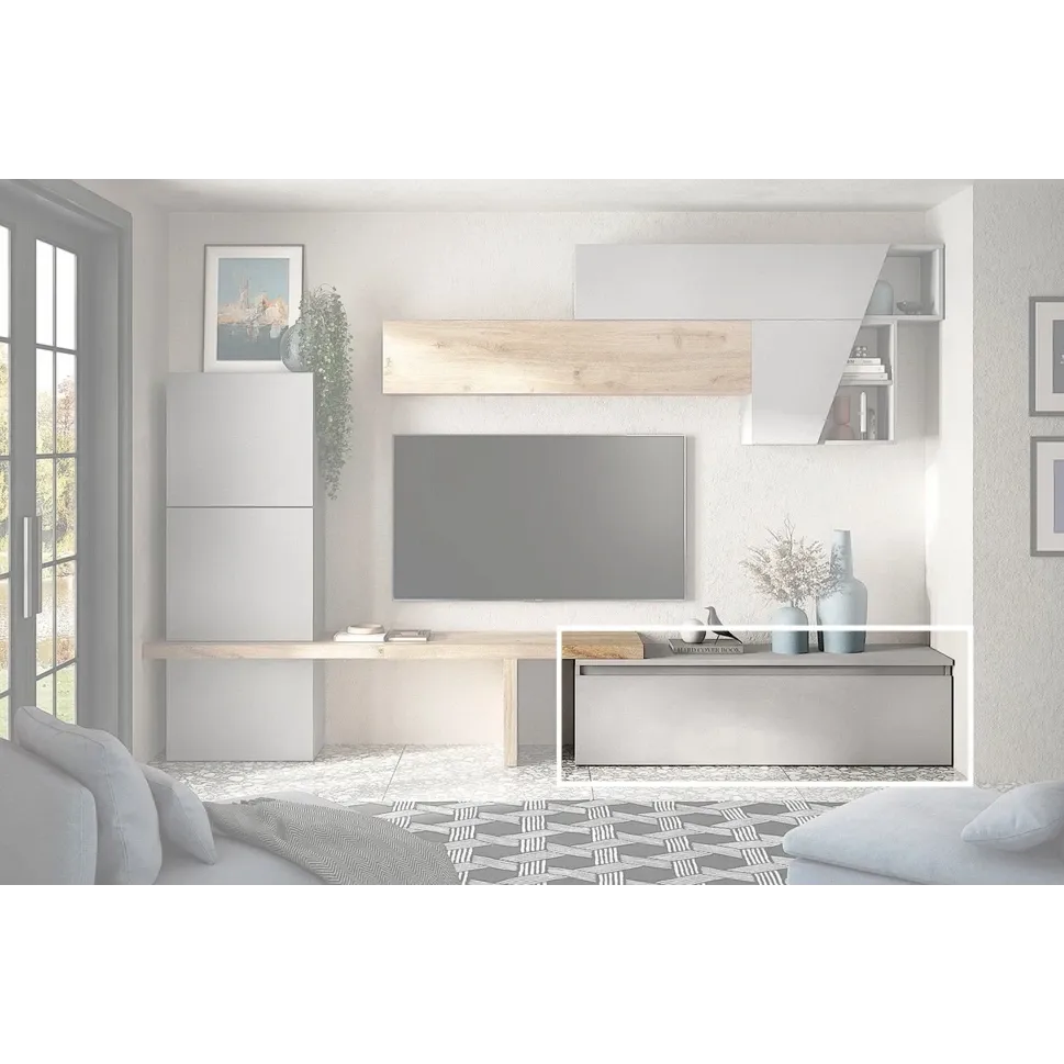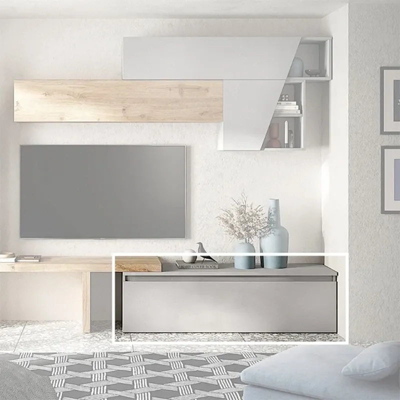 Porta tv moderno con un cassettone, proposto in finitura Gesso. Aggiungi altri elementi al tuo soggiorno oppure vedi tutta la collezione Logica.