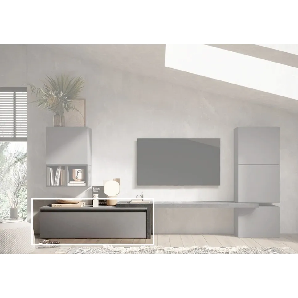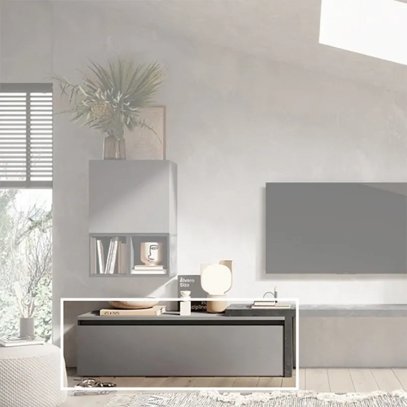La finitura Ardesia, tinta di grande tendenza, assicura all'ambiente uno stile elegante e ricercato, a disposizione vi sono numerose altre finiture, selezionabili tramite apposito configuratore, per personalizzare al meglio la base tv, adattandola così al proprio living.