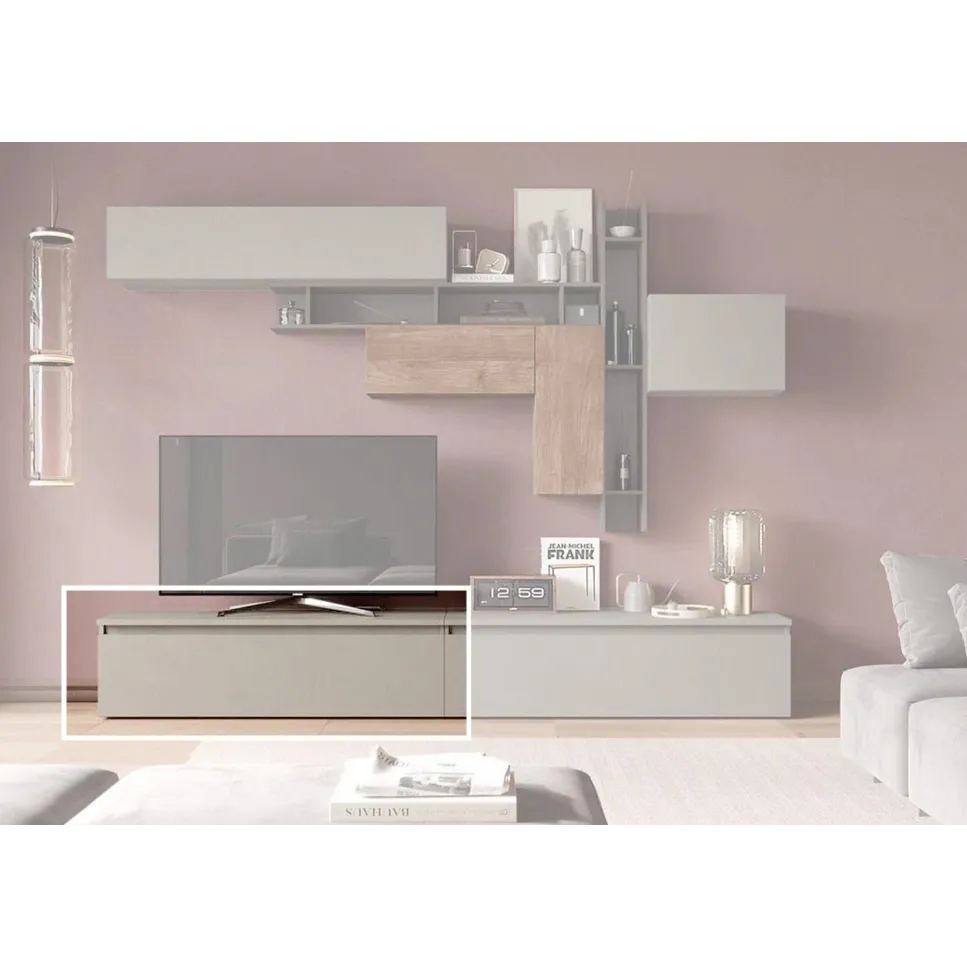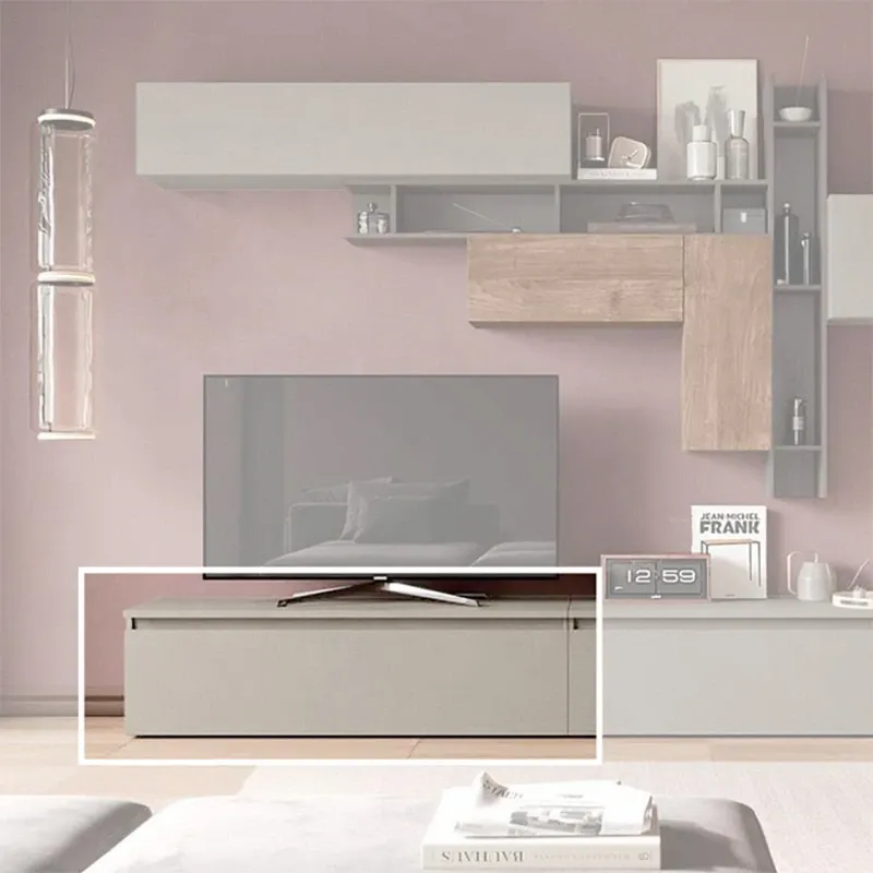 La finitura Argilla, tinta di grande tendenza, assicura all'ambiente uno stile elegante e ricercato, a disposizione vi sono numerose altre finiture, selezionabili tramite apposito configuratore, per personalizzare al meglio la base tv, adattandola così al proprio living.