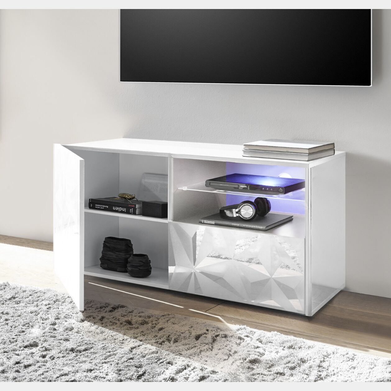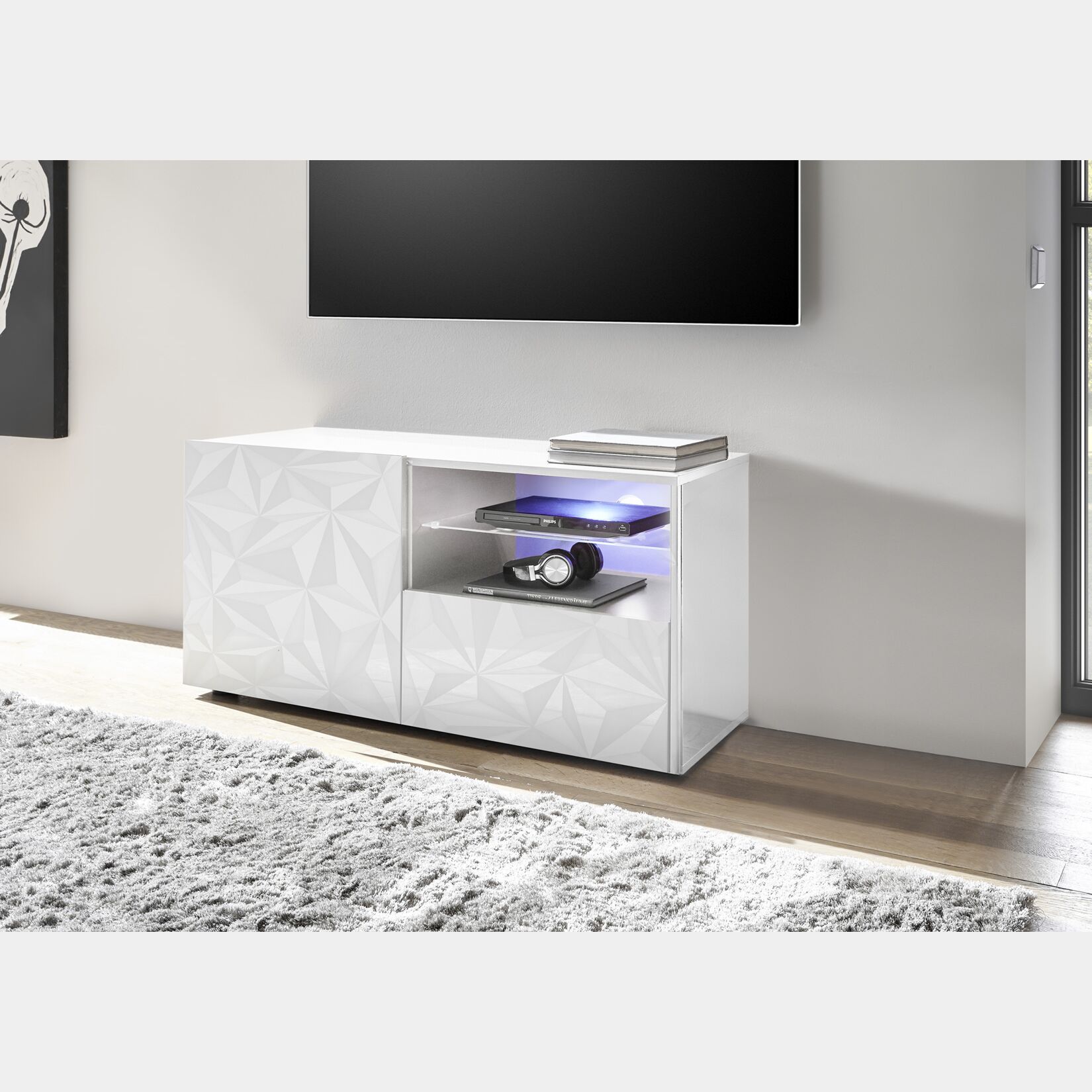 Base porta TV, 1 ante 1 cassetto, bianco laccato lucido con serigrafia prismatica, disponibile anche in grigio lucido.