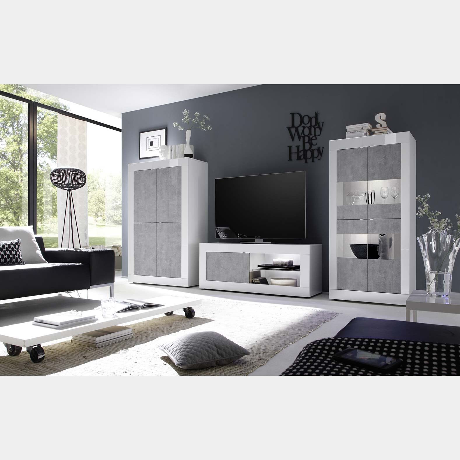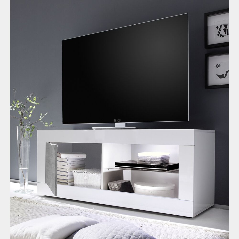 Base porta TV ad 1 anta, cemento e bianca lucido, prodotto Made in Italy. Realizzato in melaminico e con una finitura legno di alta qualità, questo porta tv dalla linea moderna e attuale viene proposto con una finitura in pregiata laccatura bianco lucido per scocca, mentre un'anta in finitura cemento.