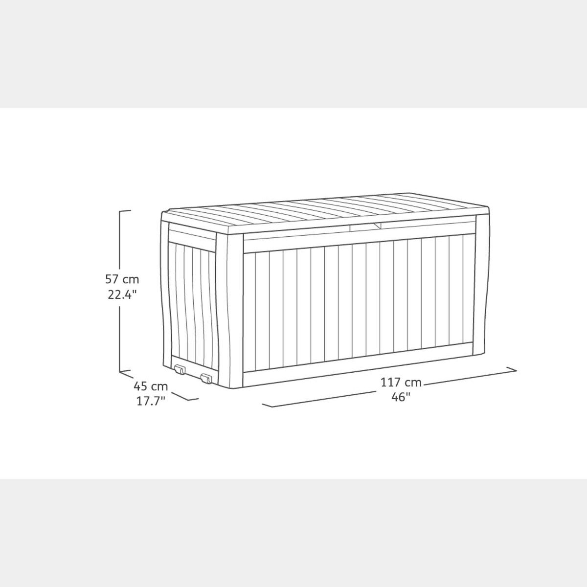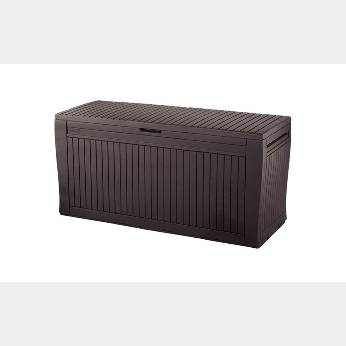 Con una capacità di 270 litri, il baule Sequoia è ideale per riporre utensili, cuscini e accessori. Grazie al suo sistema di ventilazione e alla resistenza agli agenti atmosferici, il contenuto rimarrà sempre asciutto e ventilato. La struttura resistente permette anche la seduta fino a 2 adulti sul coperchio. Si assembla in meno di 5 minuti e non richiede manutenzione.