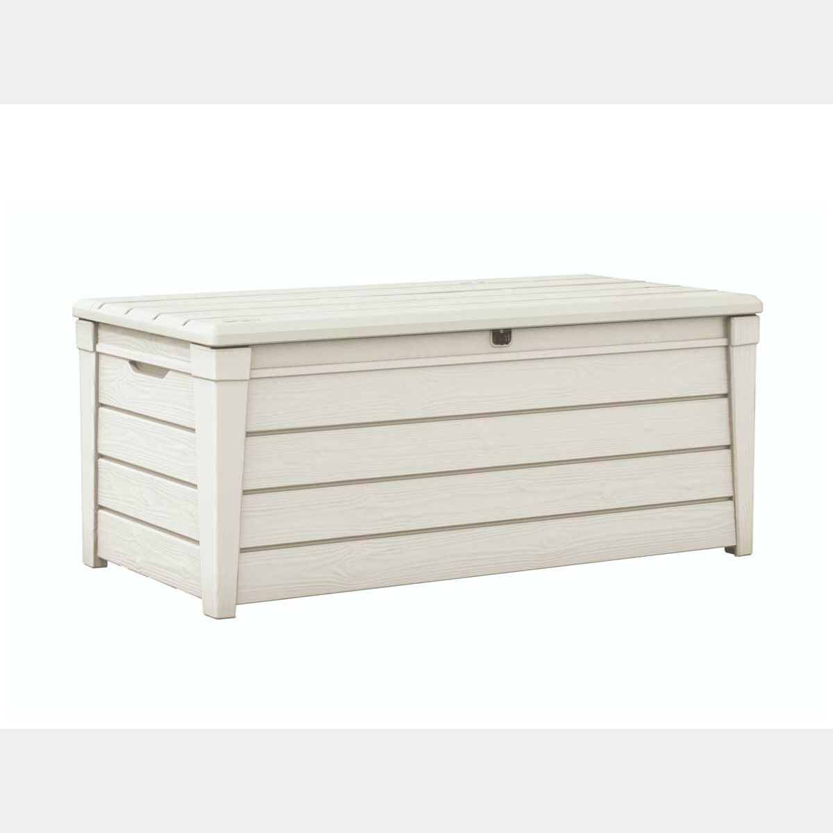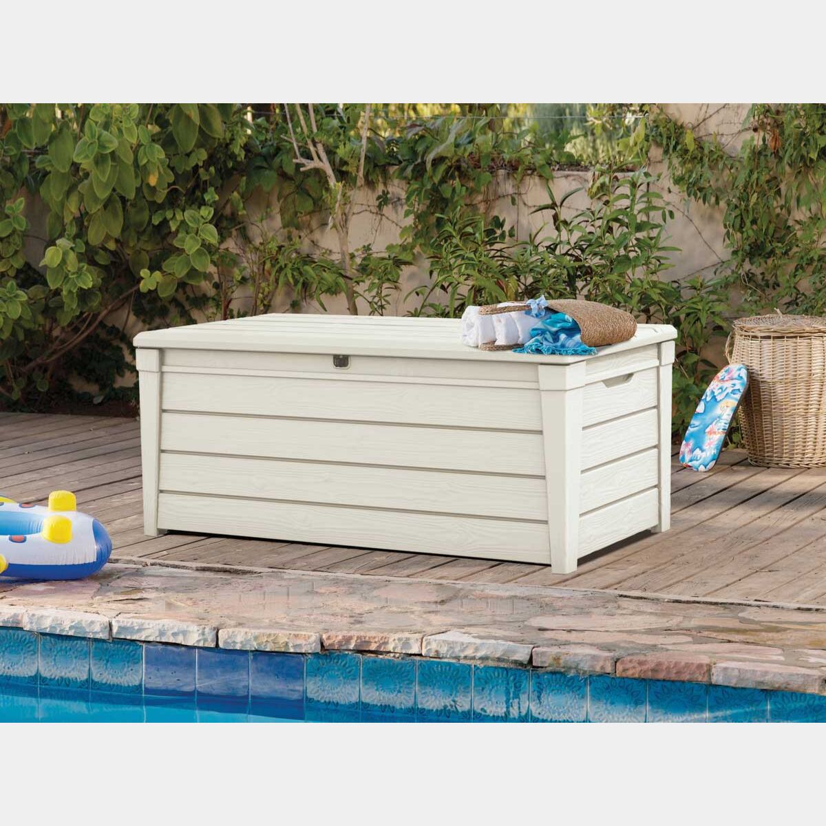 Baule da piscina realizzato con resina resistente, durevole e che richiama l'aspetto del legno. I 454 litri di capienza sono ideali per riporre cuscini, accessori da giardino e giocattoli, mantenendoli asciutti e ventilati. Il coperchio può fungere da comoda seduta per due adulti. Amerai la facilità con cui potrai ordinare i tuoi spazi esterni grazie al baule Mandorlo bianco.