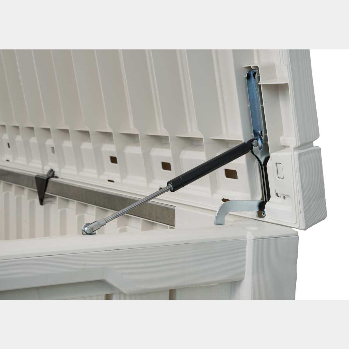 Il baule da piscina Mandolorlo bianco ha una struttura interna in metallo, una chiusura lucchettabile e ha una portata di 300 KG