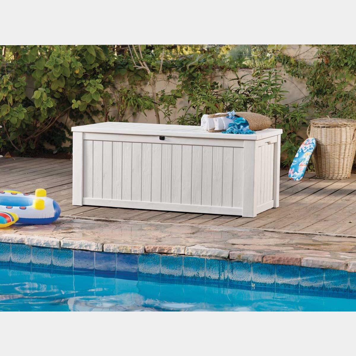 Il baule da piscina Tiglio bianco ha una struttura interna in metallo, una chiusura lucchettabile e ha una portata di 300 KG
