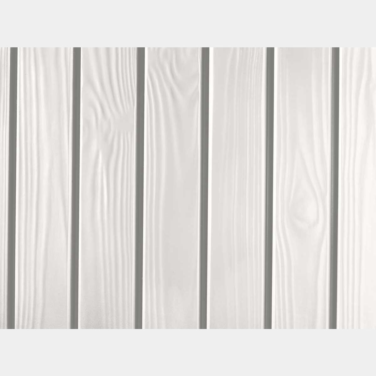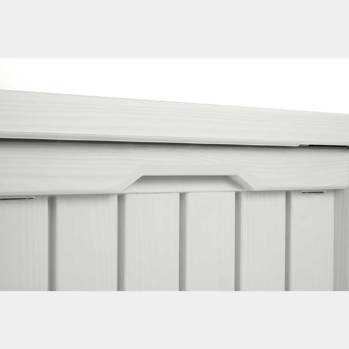 Il moderno baule da piscina è realizzato in resina con una finitura effetto legno color bianco.