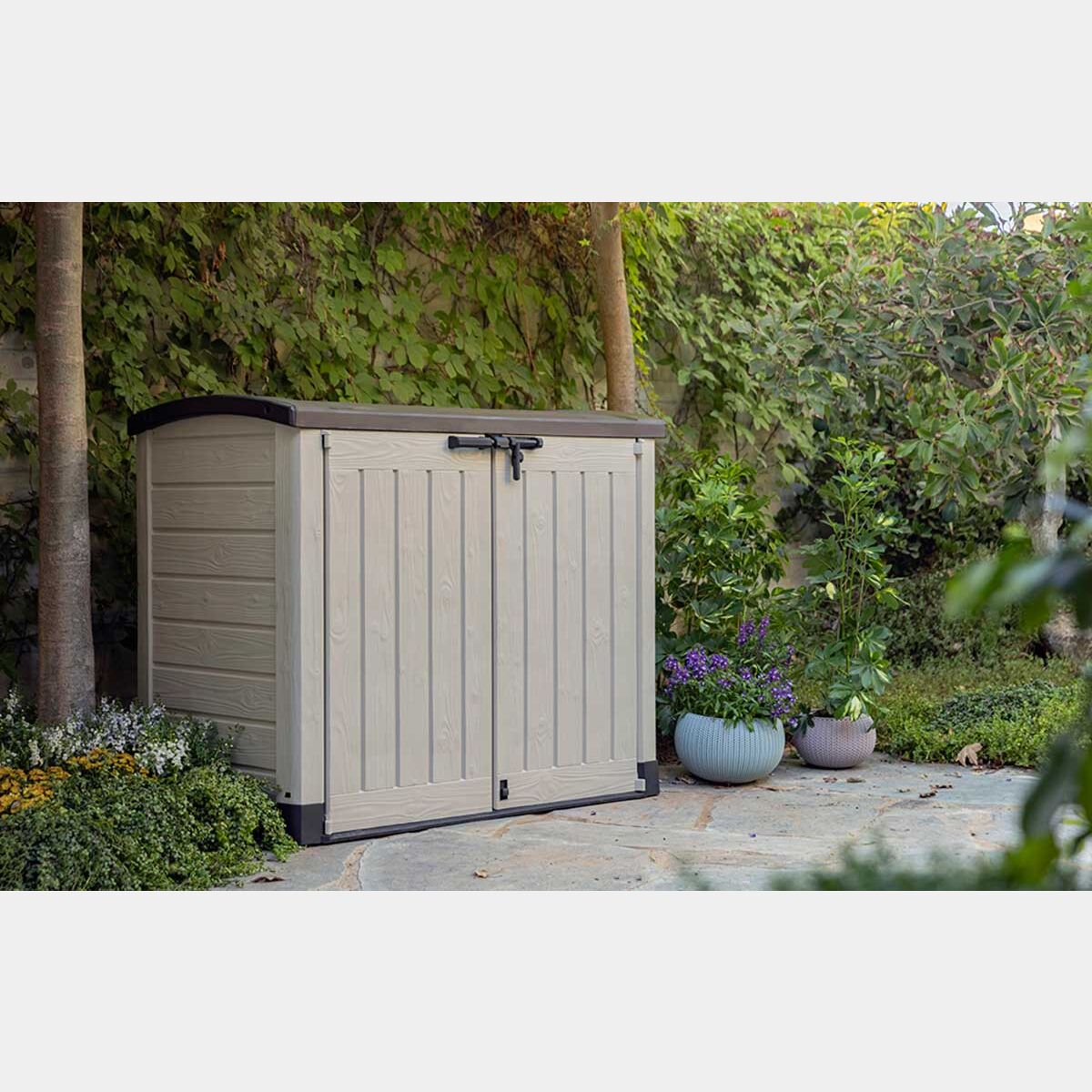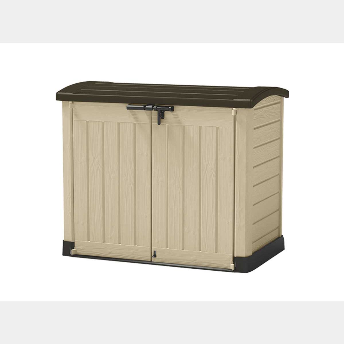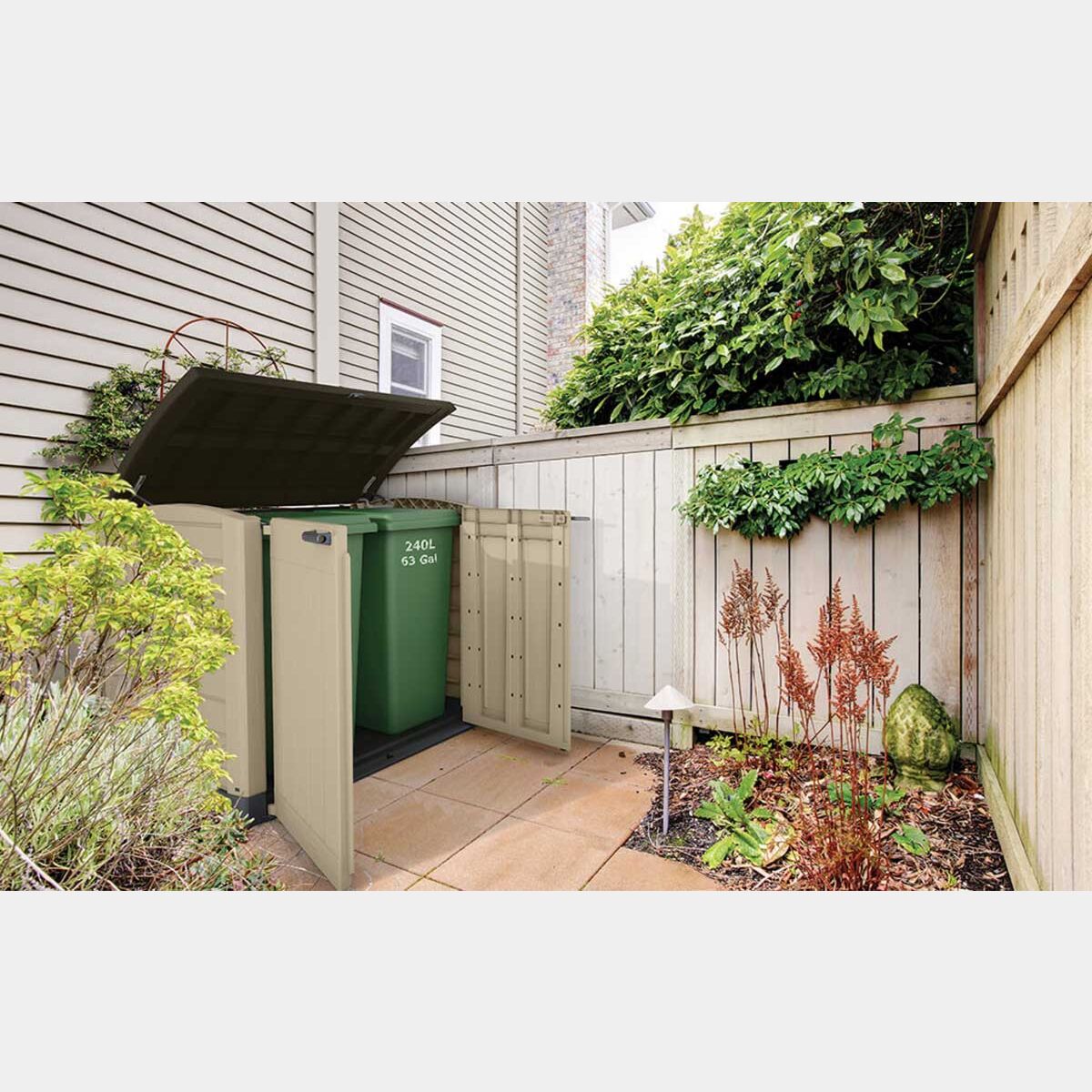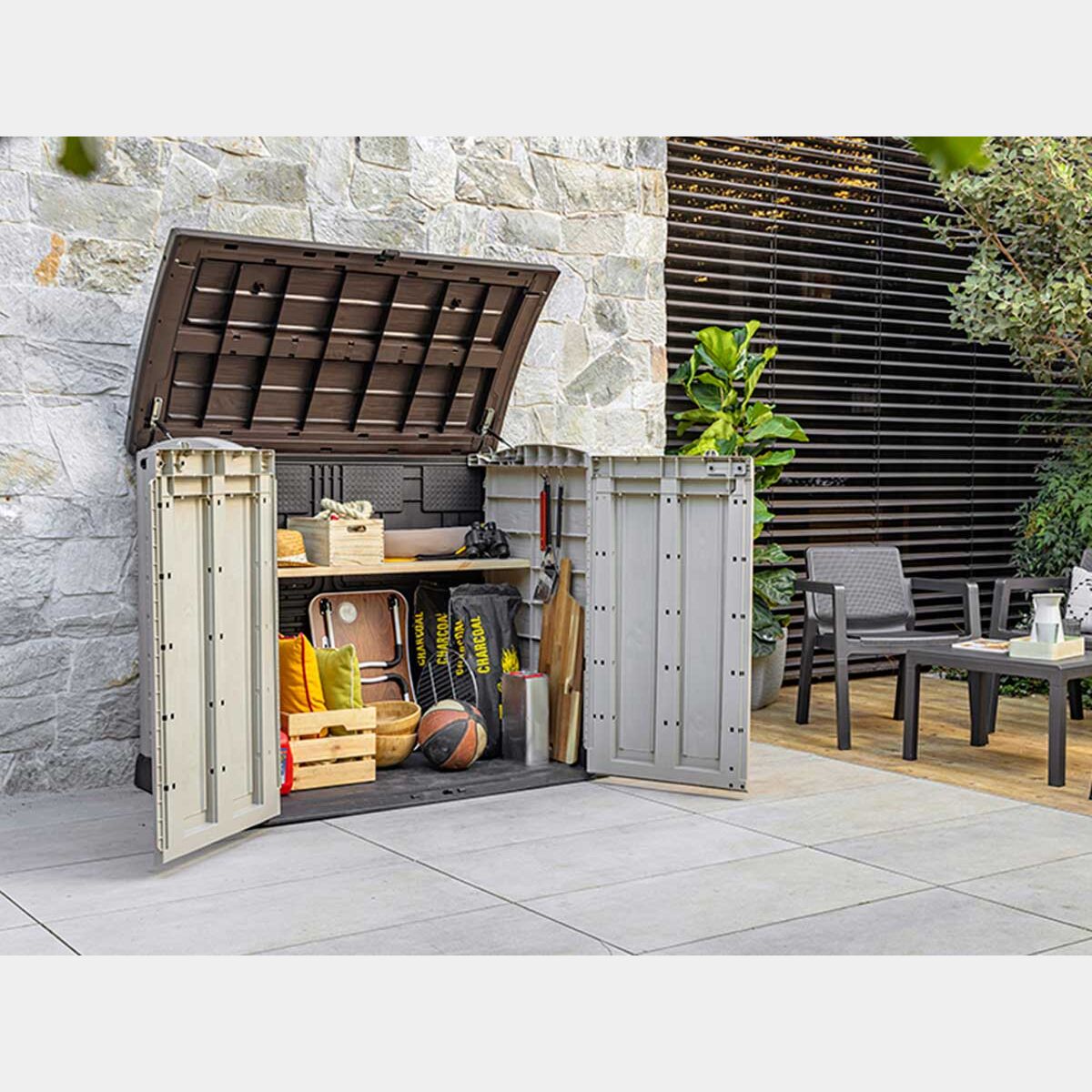 Perfetto per tagliaerba, pompe per la piscina, barbecue, attrezzi e materiali per il giardino, Salice Arc offre una soluzione versatile con una capacità fino a 1200 litri. Facile da assemblare, dotato di un coperchio e apertura frontale a due ante e di un pavimento con invito per facilitare l'accesso di oggetti dotati di ruote. Durevole e resistente agli agenti atmosferici, mantiene il contenuto asciutto e pulito. Può contenere fino a 2 bidoni dalla capacità di 240 litri. Kit per l'aggancio dei bidoni incluso.