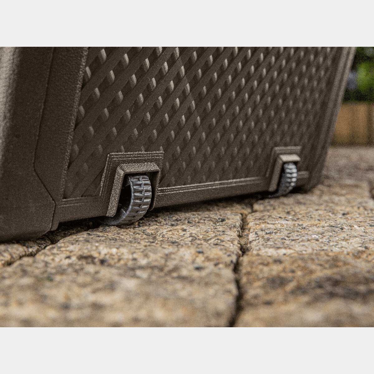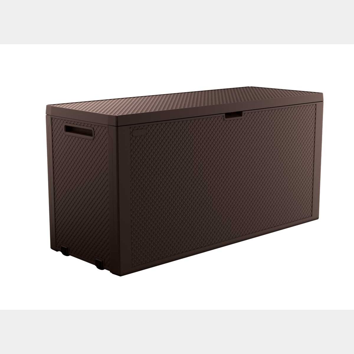 Baule per esterni modello "Olivo" è in resina con capacità di 270 litri, colore marrone. Baule resistente e multiuso ideale per il riponimento di oggetti da giardino, giocattoli, o cuscini. Può essere usato anche come seduta per i momenti di relax.