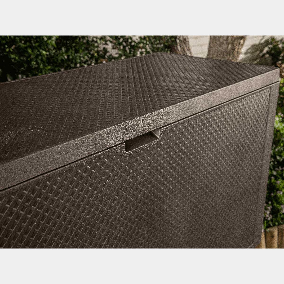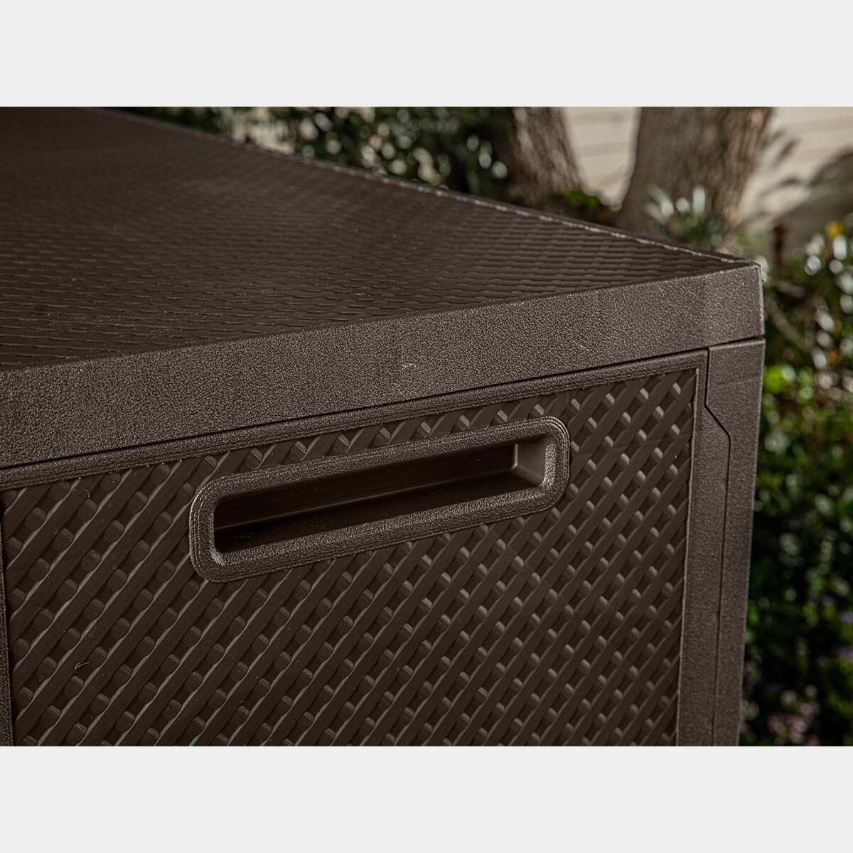 Il moderno baule da esterno è realizzato in resina ed ha una finitura Mesh che riproduce l'effetto di una superficie intrecciata