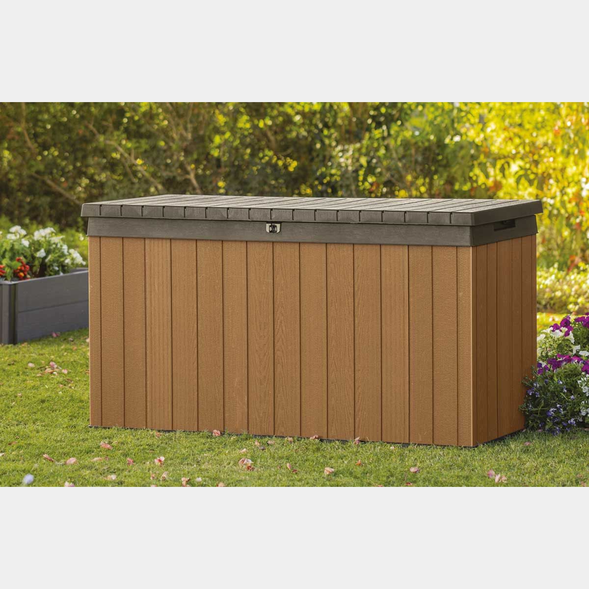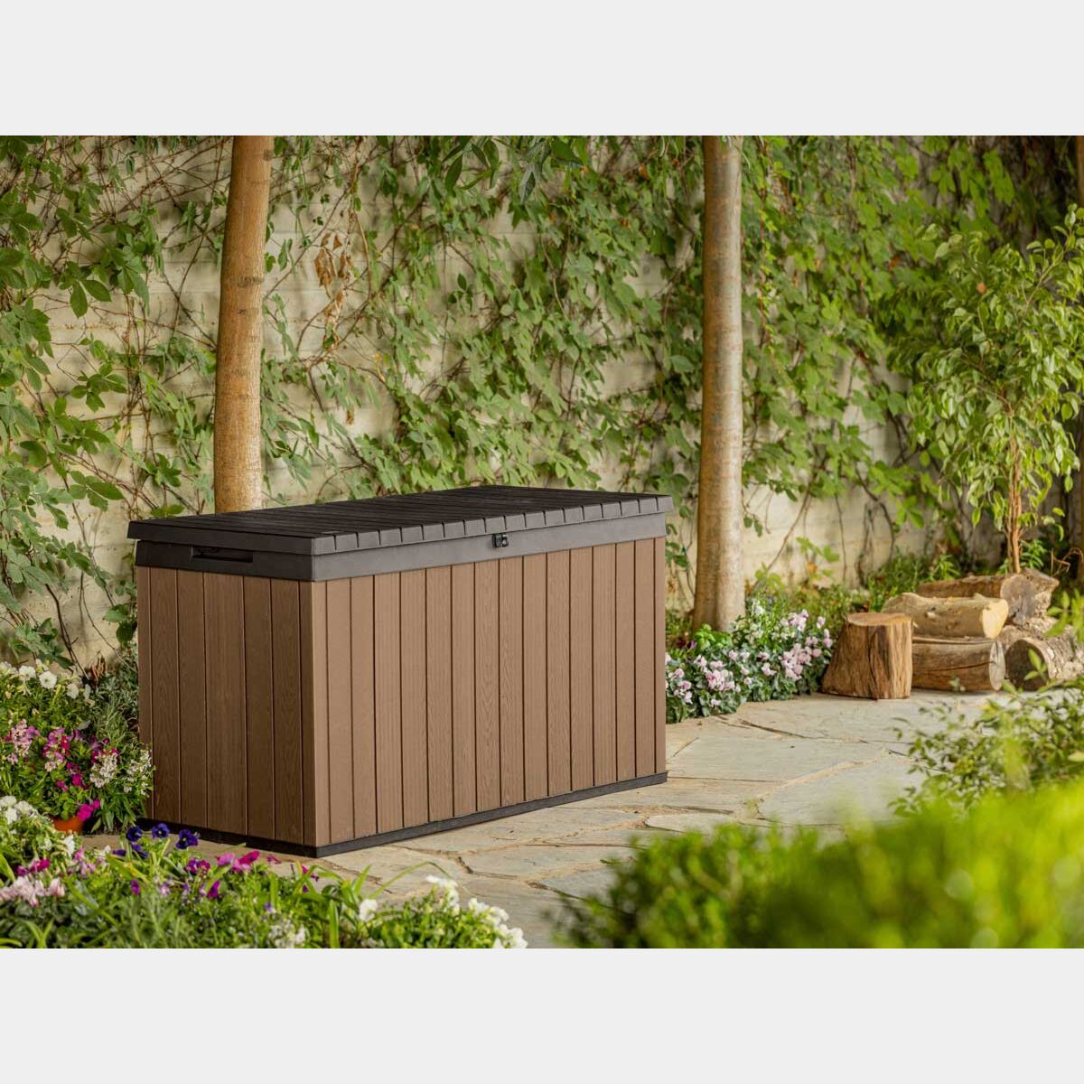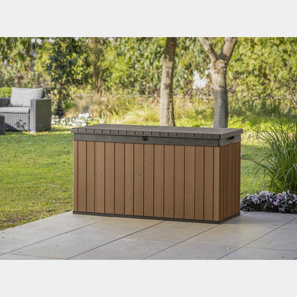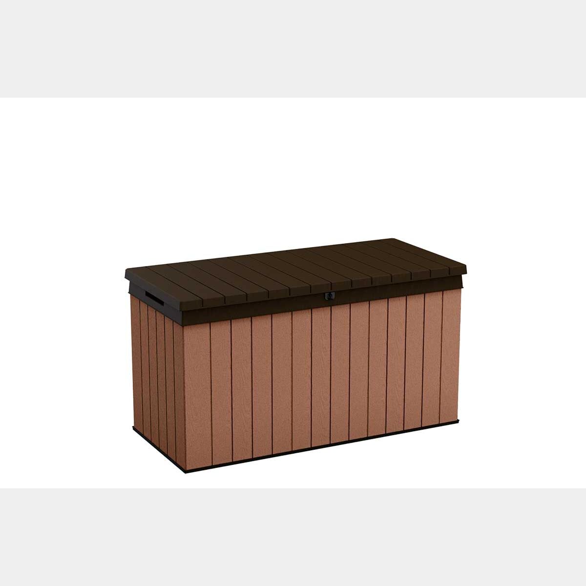 Baule da esterno modello "Cerro / L" in resina con capacità di 570 litri, colore marrone. Baule resistente e multiuso ideale per il riponimento di oggetti da giardino, giocattoli, o cuscini. Può essere usato anche come seduta per i momenti di relax.